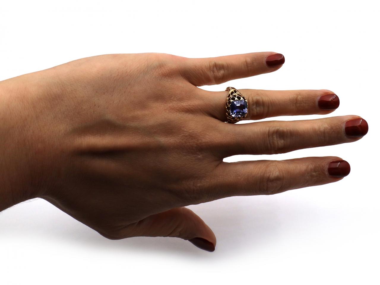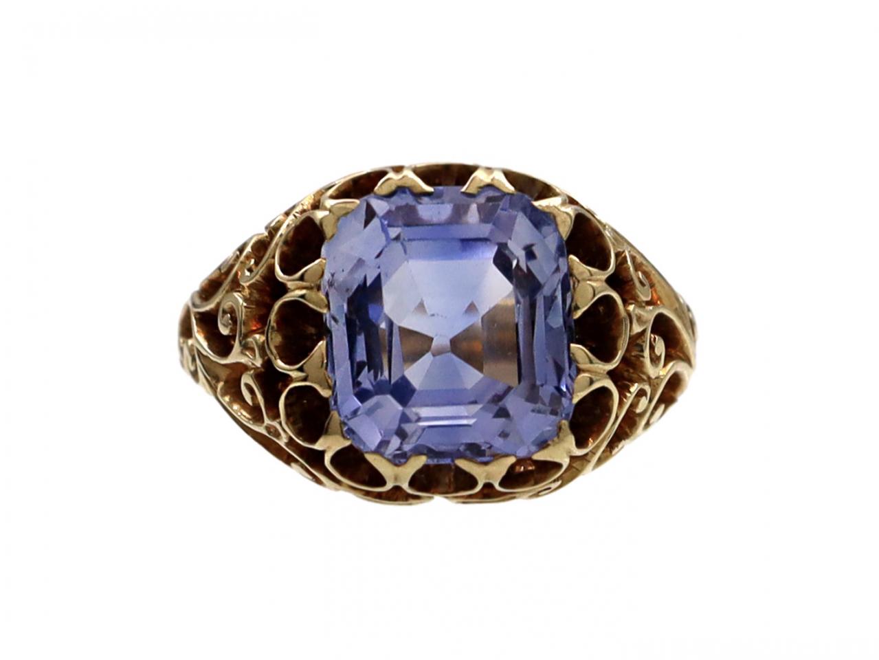 Antique pastel purple sapphire ring in 18kt yellow gold. Centred with a 4.78ct octagonal emerald cut pastel purple sapphire with no indications of heat treatment, in bespoke claw setting, to an intricately openwork carved bombe ring with curving claws, terminating to a solid shank. Marked 18kt gold.