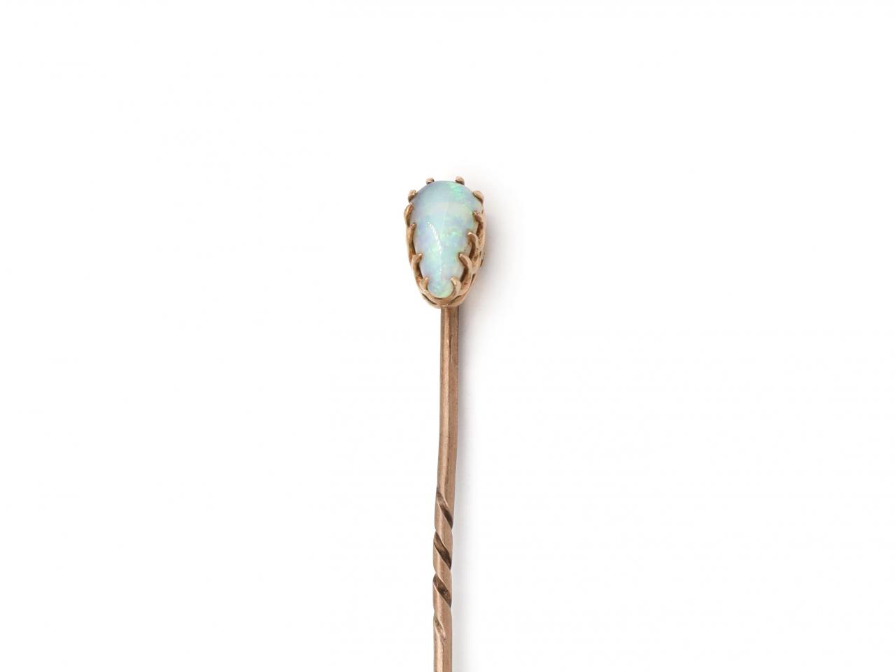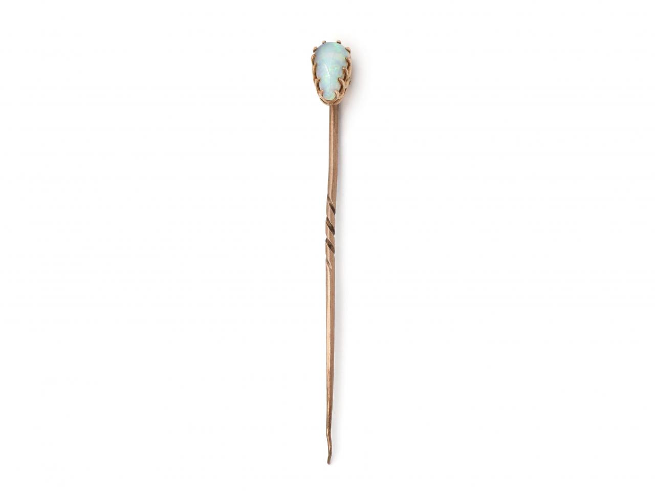 Antique pear shape opal cabochon stickpin in yellow gold. A straight stickpin with a barley twist fitted to the top with a pear shape cabochon cut opal in a claw setting.