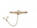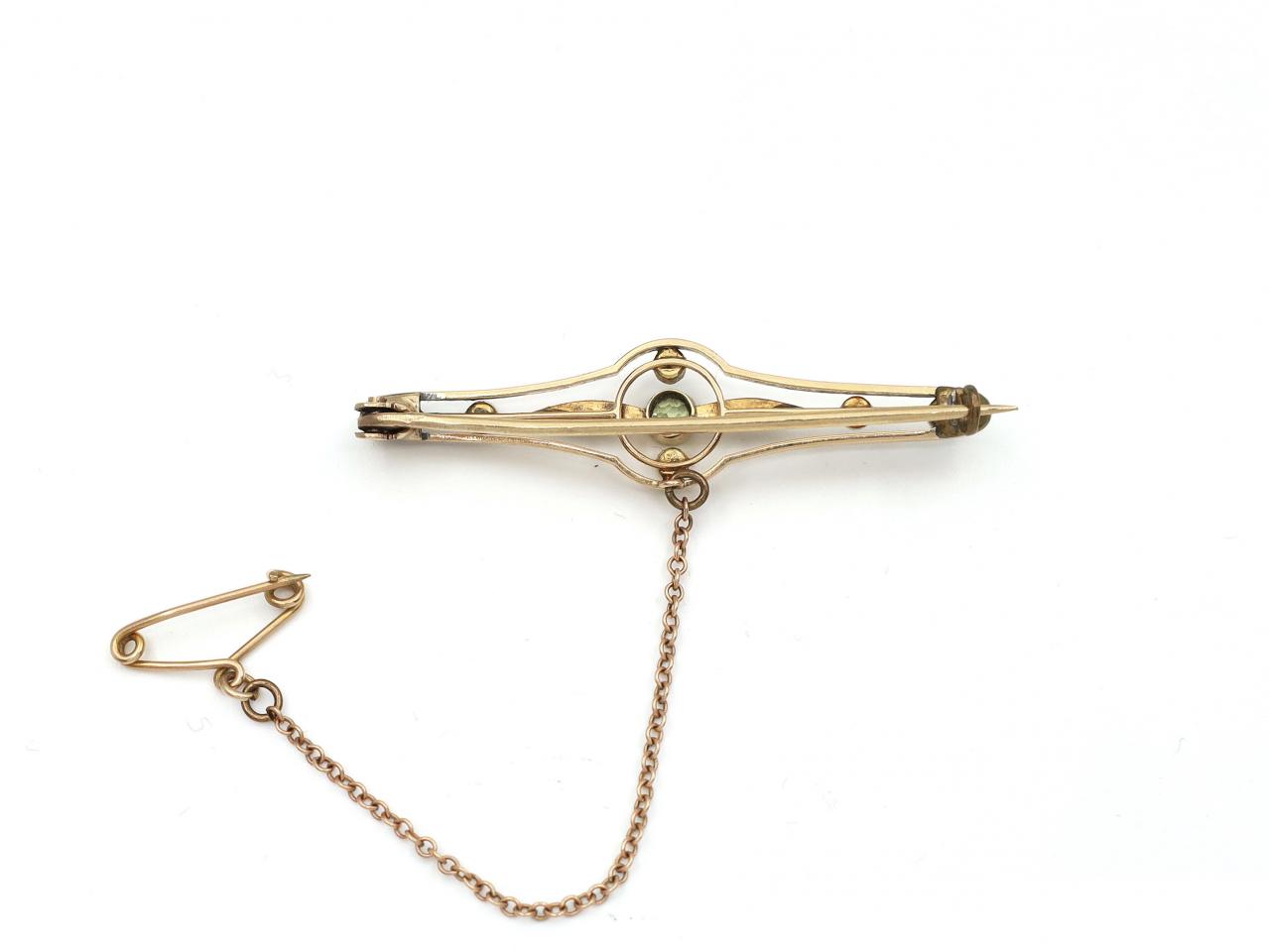 Antique peridot and seed pearl bar brooch in yellow gold. An openwork yellow gold bar brooch decorated with a round mixed cut peridot and seed pearls, fitted to the reverse with a hinged pin, secured by a C-scroll and safety chain.