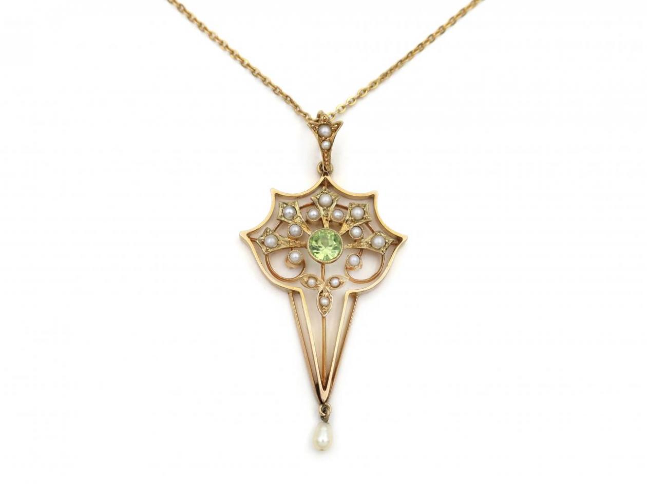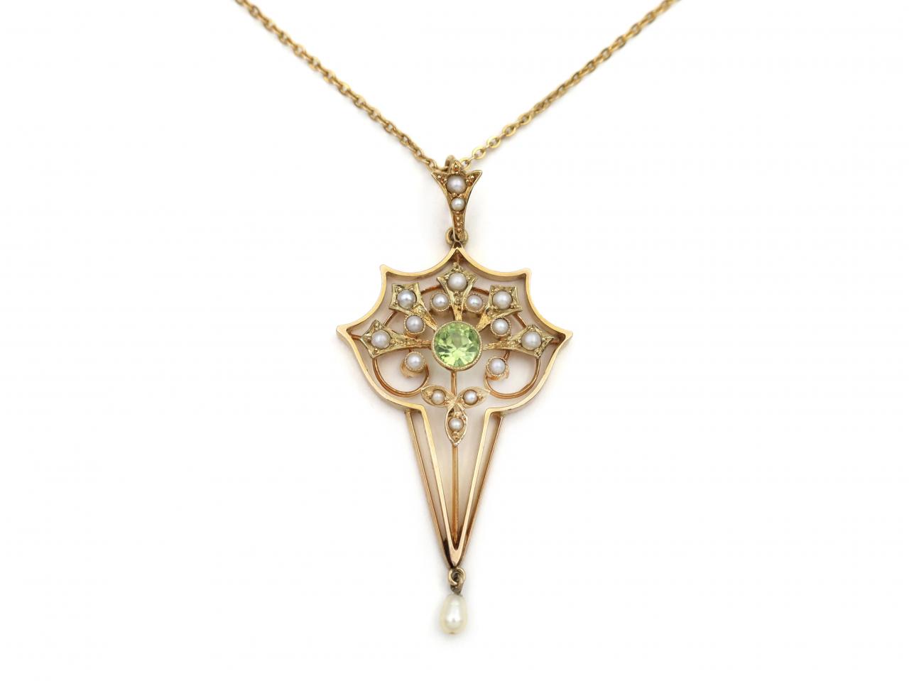 Antique Peridot & Seed Pearl Pendant in Yellow Gold