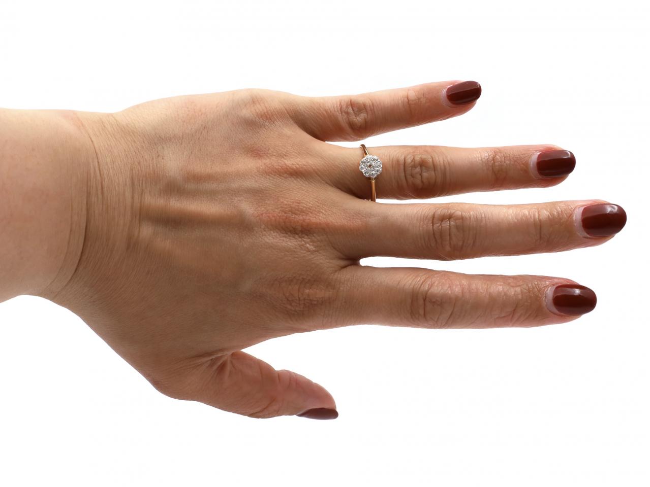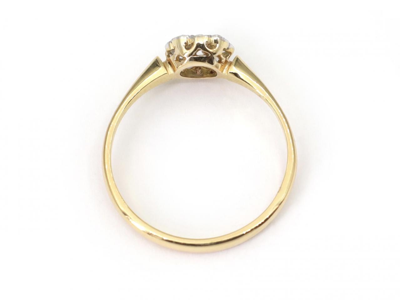 Antique petite diamond floral cluster ring in platinum and 18kt yellow gold. Set with round Old Cut diamonds in platinum millegrain settings, to a dainty floral cluster with subtle scalloped edging, pierced open gallery and flanked to either side with raised champfered shoulders which sweep to a solid shank. Marked 18kt gold.