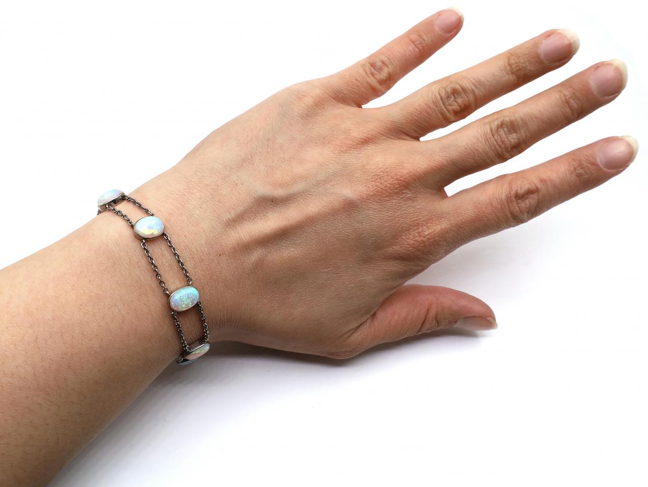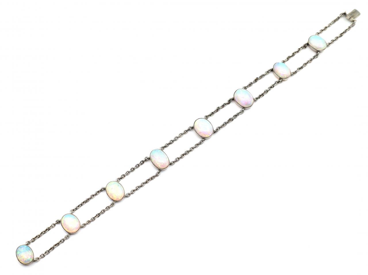 Antique platinum and water opal double chain bracelet. A bracelet consisting of eight oval cabochon cut water opals in rubover collet settings, each connected by two platinum chains, terminating to a hidden push clasp.
