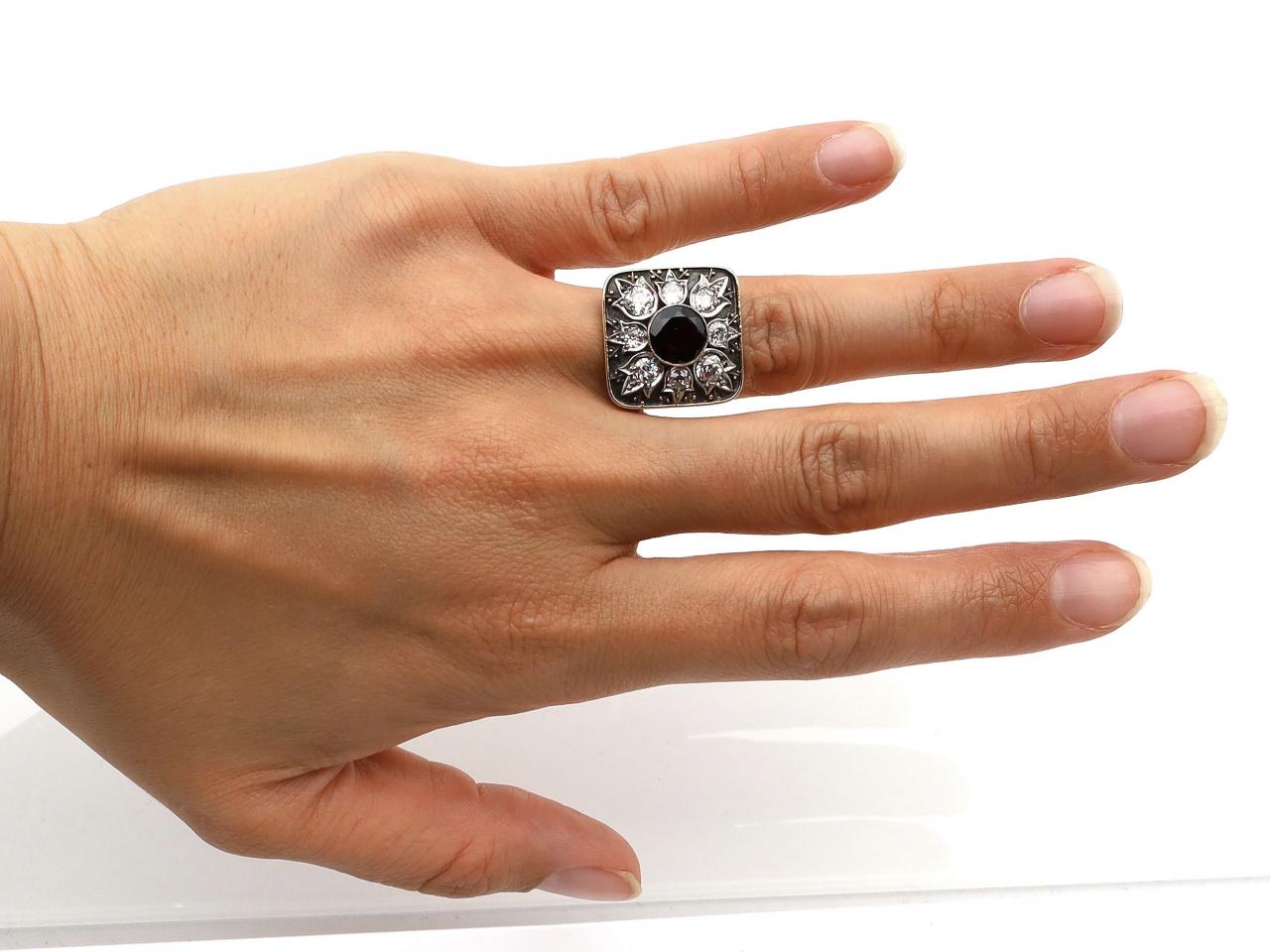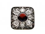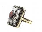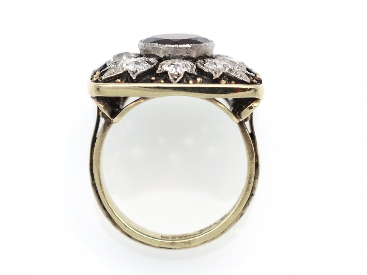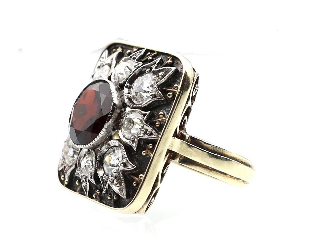 Antique Richter Von Berchem garnet and diamond dress ring in 14kt yellow gold. Centred with a round mixed cut garnet in a raise rubover setting, surrounded by a square plaque set with eight round Old European cut diamonds in tulip settings, granule decoration and subtle millegrain edges, fitted with an openwork gallery and flanked by ribbed shoulders which curve to a solid shank. Signed 'Richter V. Berchem D.W.B. German.