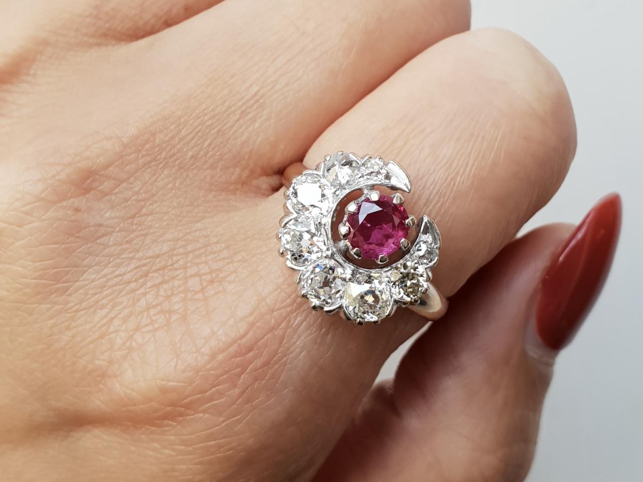 Antique ruby and diamond crescent moon ring in 14kt yellow and white gold. Centred with a round mixed cut ruby in a floating claw collet setting, surrounded by eight cushion shape Old cut diamonds in claw settings, to a crescent moon design with bespoke settings and pierced gallery, the rounded shoulders continue to a solid shank. Estimated total diamond weight 1.50cts.