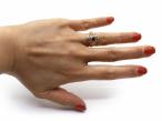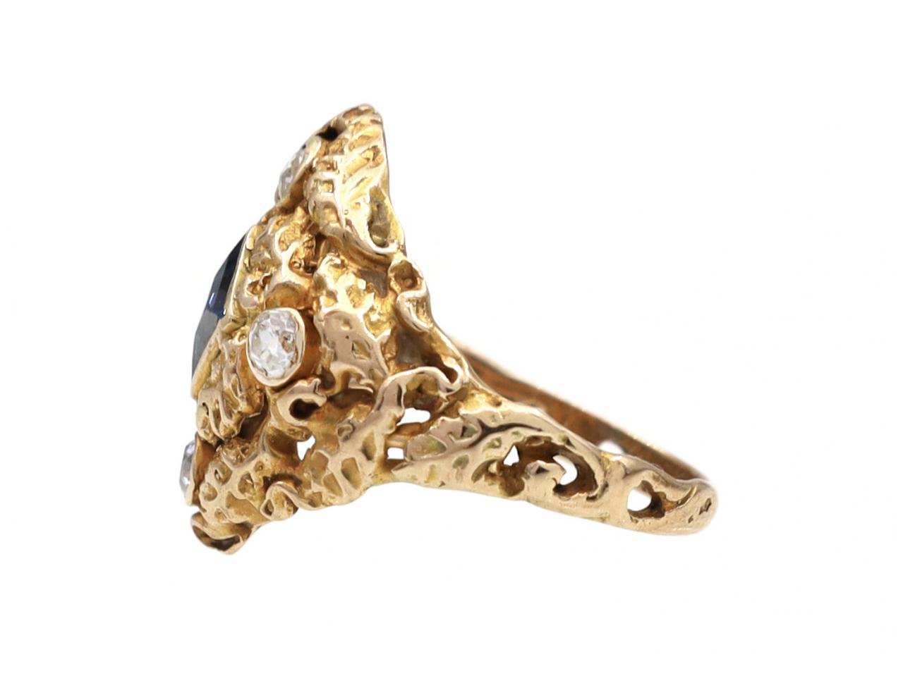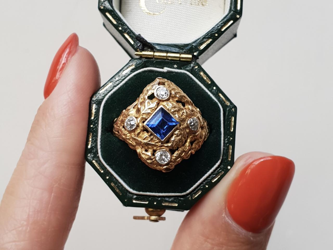 Antique sapphire and diamond carved ring in 14kt yellow gold. Centred with an estimated 0.40ct square step cut sapphire in a rubover setting, set at the cross sections with round old cut diamonds in rubover settings, to a chunky marquaise shape carved cluster with foliate details and openwork chasing which continues to a smooth shank.