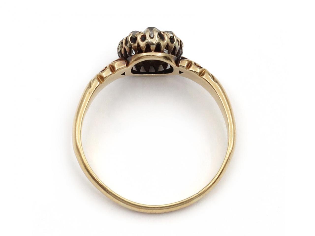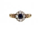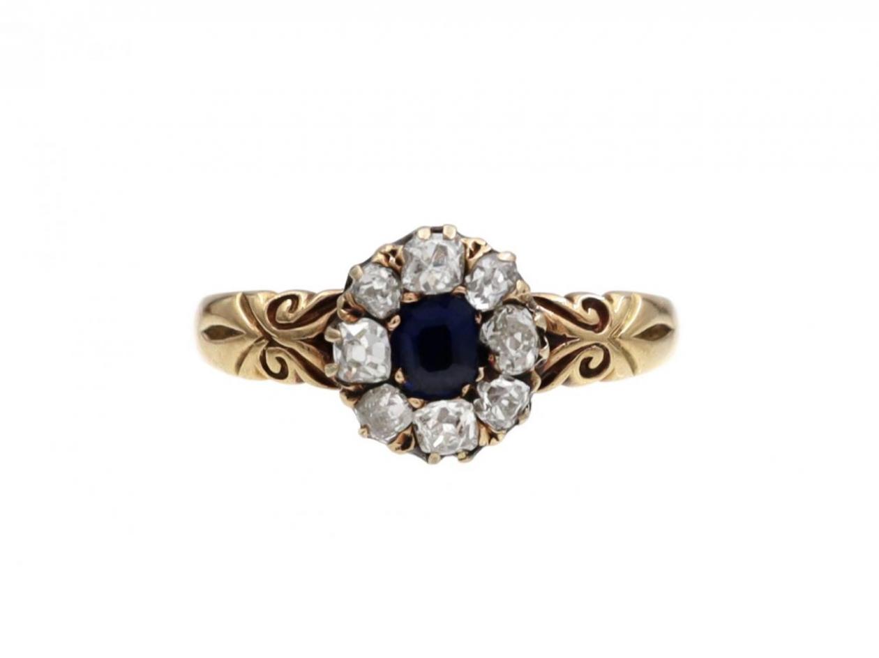 Antique sapphire and diamond coronet cluster ring in 18kt yellow gold. Centred with a cushion shape mixed cut sapphire in a claw setting, encircled with a row of cushion shape Old Mine cut diamonds in claw settings, to a circular cluster design with curving claws, pierced gallery and flanked to either side with engraved trumpeting shoulders which smooth to a solid shank.
