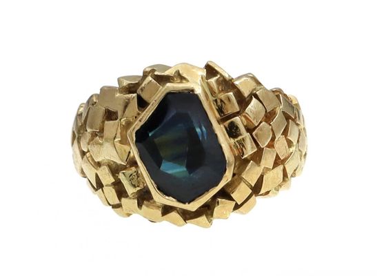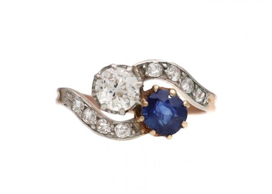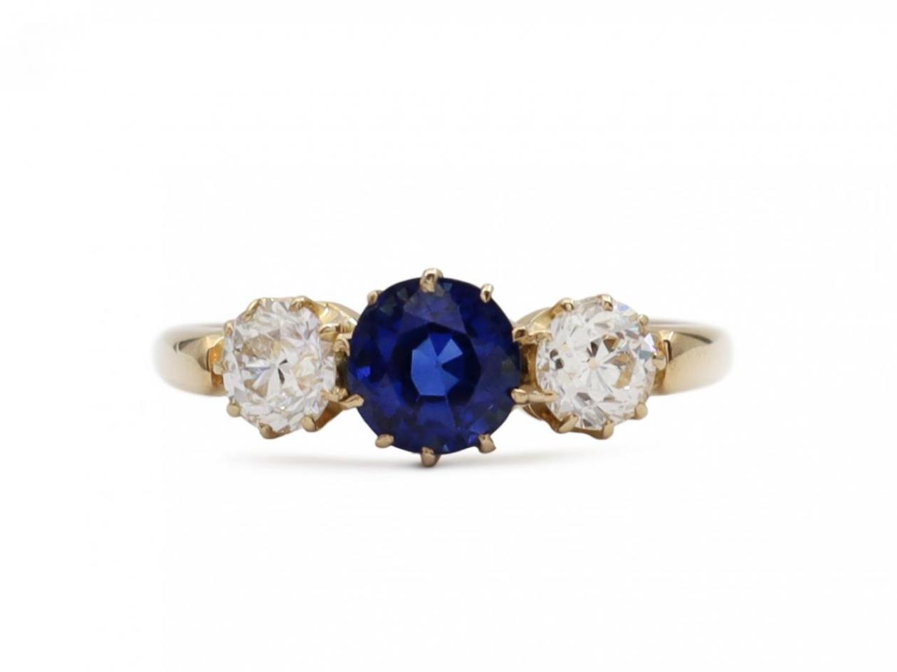 Antique sapphire and diamond three stone engagement ring in 18kt yellow gold. Set with an estimated 0.95ct round mixed cut sapphire in a fine claw setting, flanked by two round Old European cut diamonds in fine claw settings, to a graduating three stone ring with curving claws, pierced gallery and met to either side with pinched shoulders which flow to a solid shank. Estimated total diamond weight 0.60cts. Numbered '9820'.