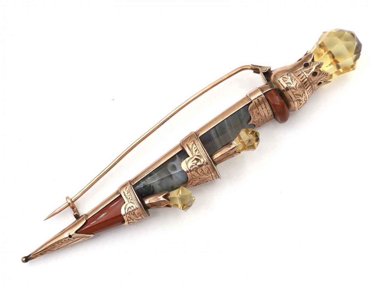 antique kilt pin with citrine crown and agate Antique Scottish agate and citrine brooch in rose gold