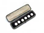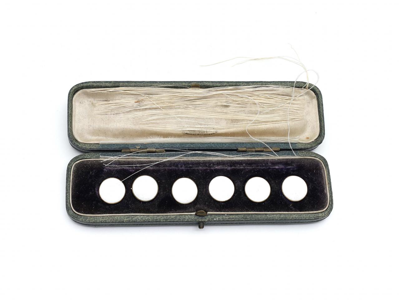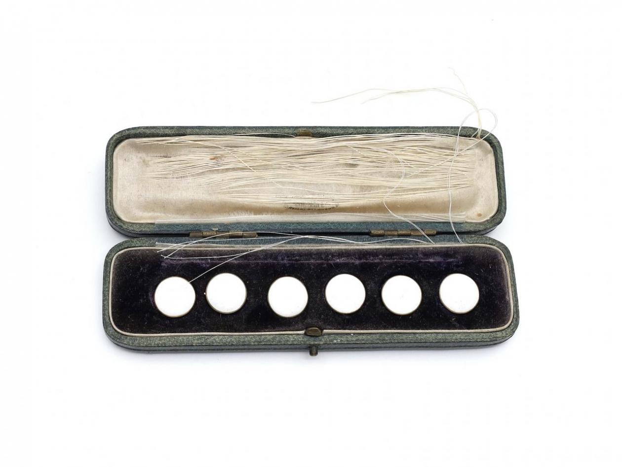 Antique set of round white enamel buttons. A set of six round base metal buttons decorated with white enamel, each matched with a spiral base metal keeper. Accompanied by a fitted antique box.