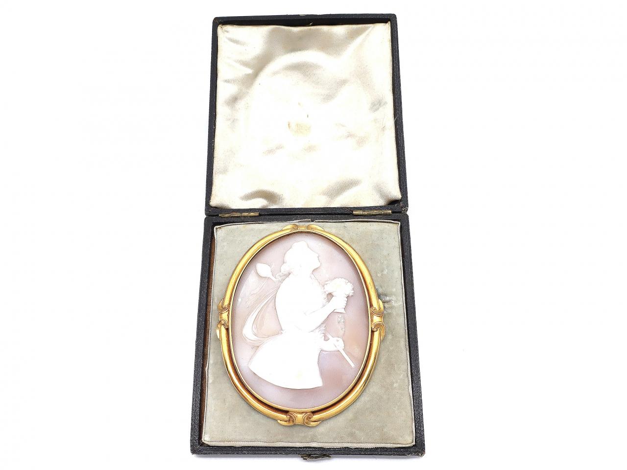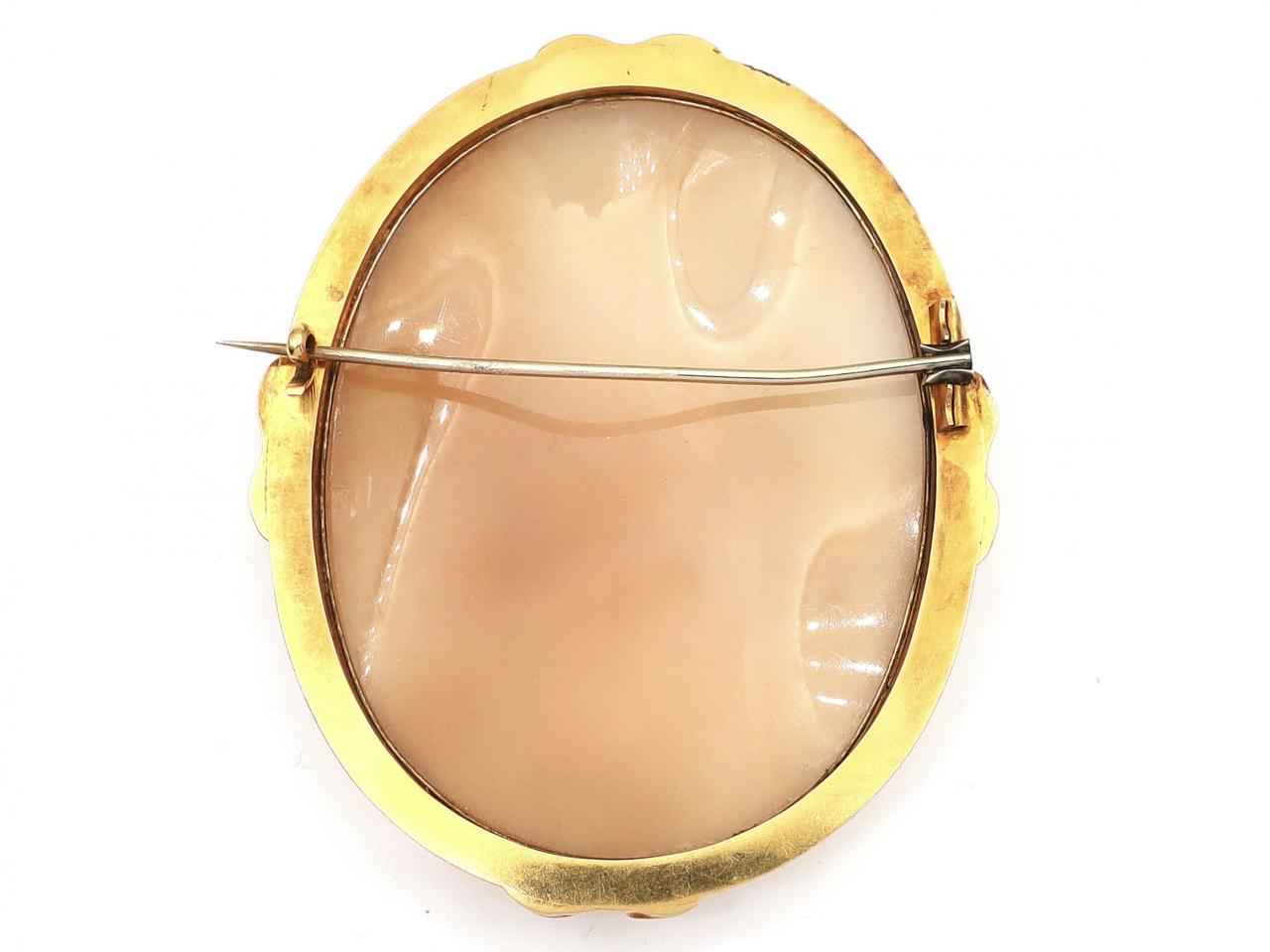 Antique shell cameo depicting Greek Goddess Hera in gold. A large oval conch shell cameo, carved with the portrait of the goddess Hera, holding a lotus tipped staff wearing a flowing gown and a sash of a lion's head, framed by a decorative yellow gold border and fitted to the reverse with a hinged pin and C-scroll.
