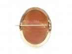 Antique shell cameo of a woman's profile brooch in yellow gold. Centred with an oval shell cameo featuring the detailed profile of a lady in relief, with a classical hairstyle beaded necklace and one shoulder gown, bordered by a rubover yellow gold frame and fitted to reverse with a secure hinged pin and C-scroll.