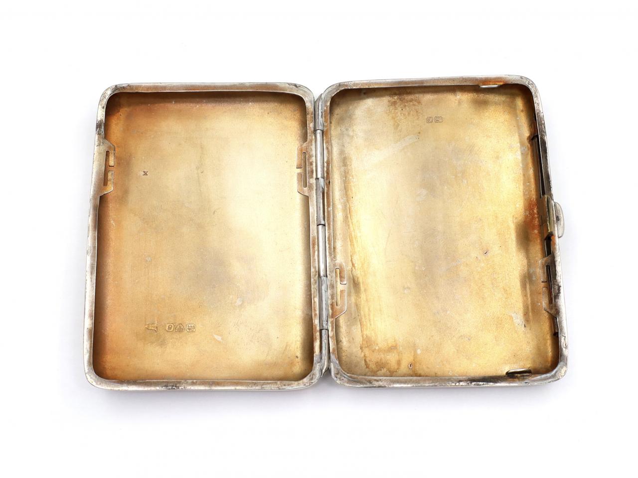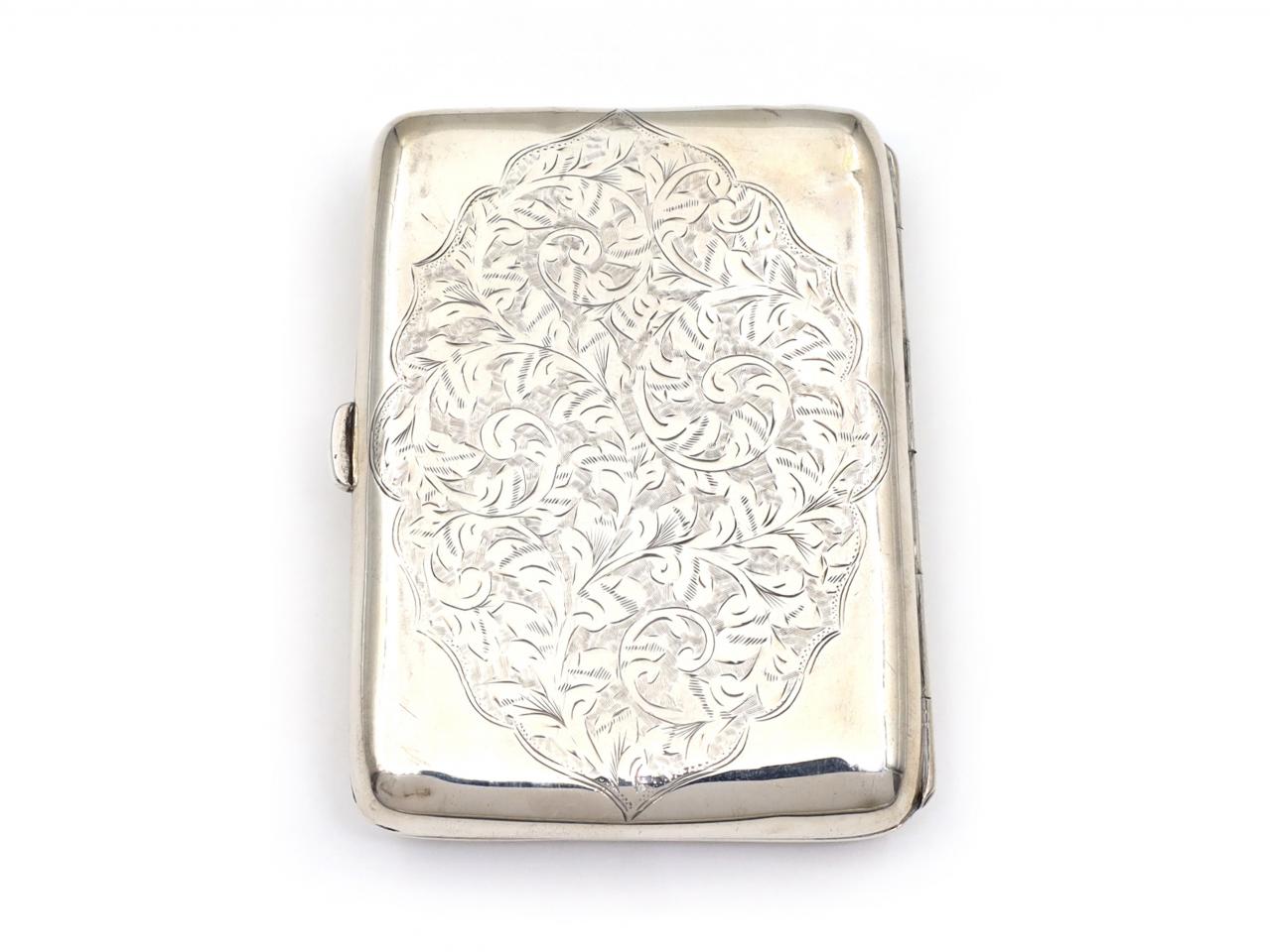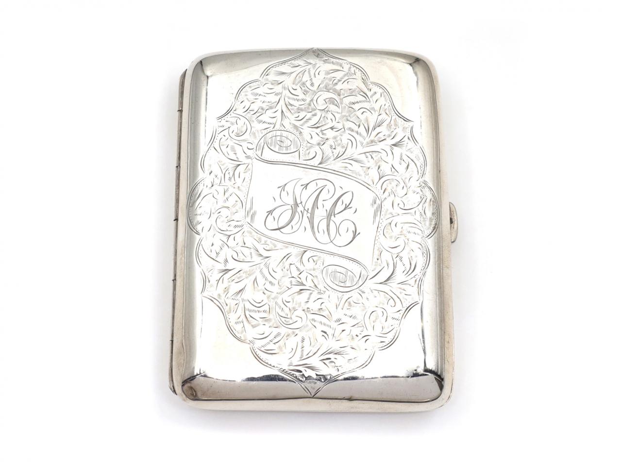 Antique sterling silver curved rectangular case with elaborate engraving to front and back, fitted to the side with a push button clasp.