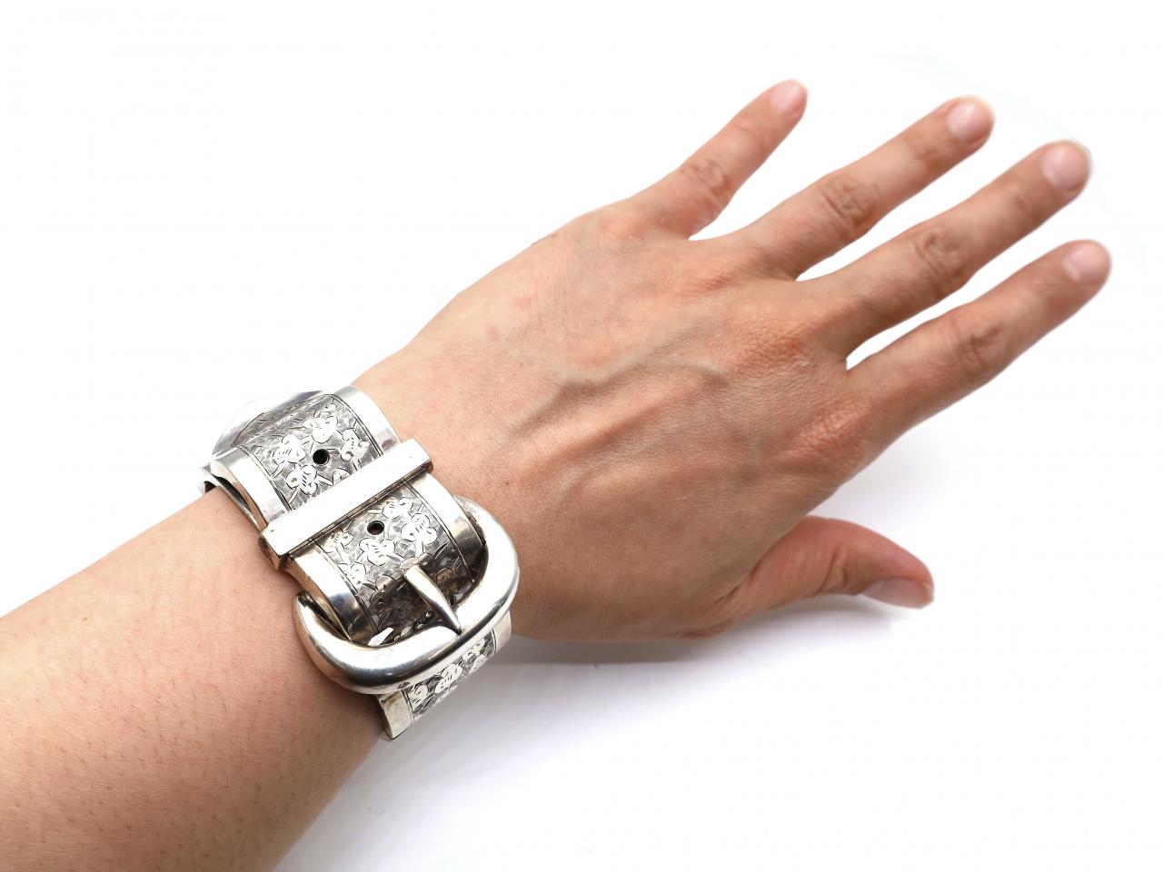 Antique sterling silver engraved buckle bangle. A chunky hinged bangle in the form of a belt buckle, decorated with intricately engraved repeating patterns and fitted with a secure push clasp and hinged safety figure of eight.