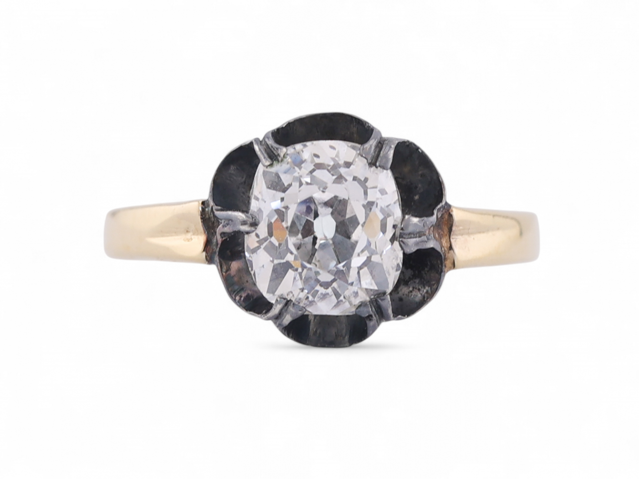 Antique style ring set with an old mine cushion cut diamond, estimated at 1.71ct, assessed as colour H–I, clarity I. The diamond is mounted in silver within a scalloped surround, to an 18kt yellow gold band.