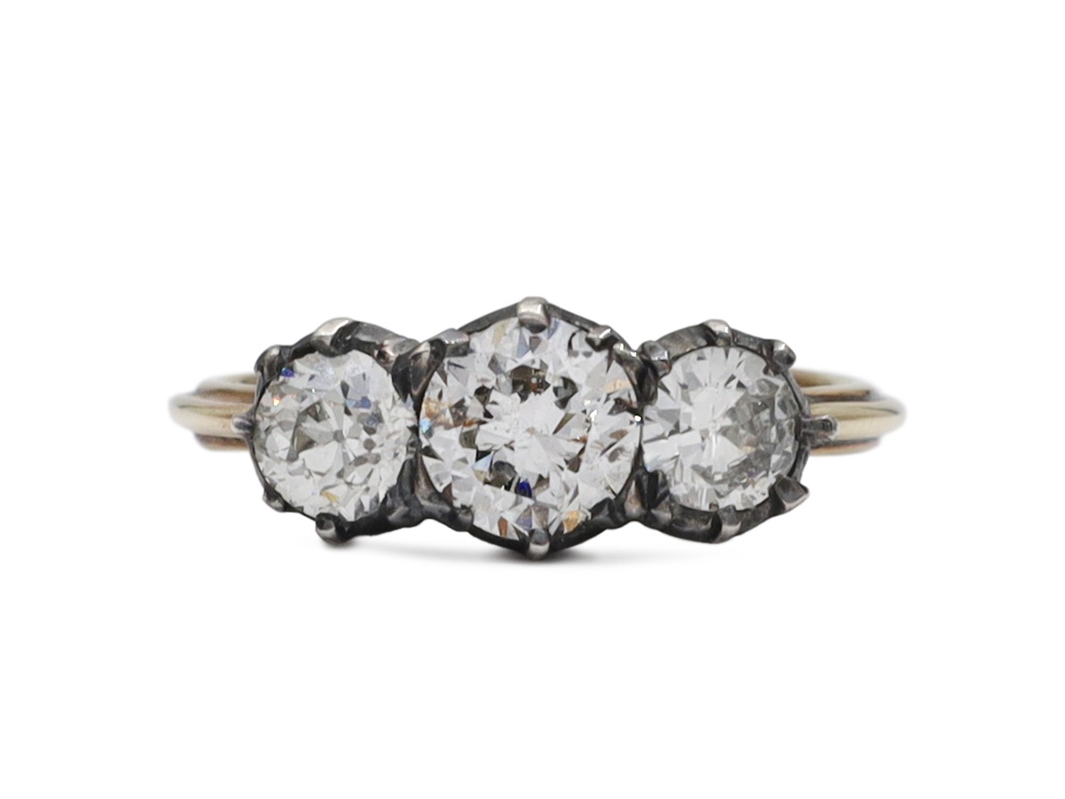 Antique style diamond three stone engagement ring in silver and 18kt yellow gold. Set with three round brilliant cut diamonds in silver cutdown settings, to an elegant graduating three stone design with enclosed gallery and flanked to either side with a slim tiered shank. Estimated total diamond weight 1.30cts.