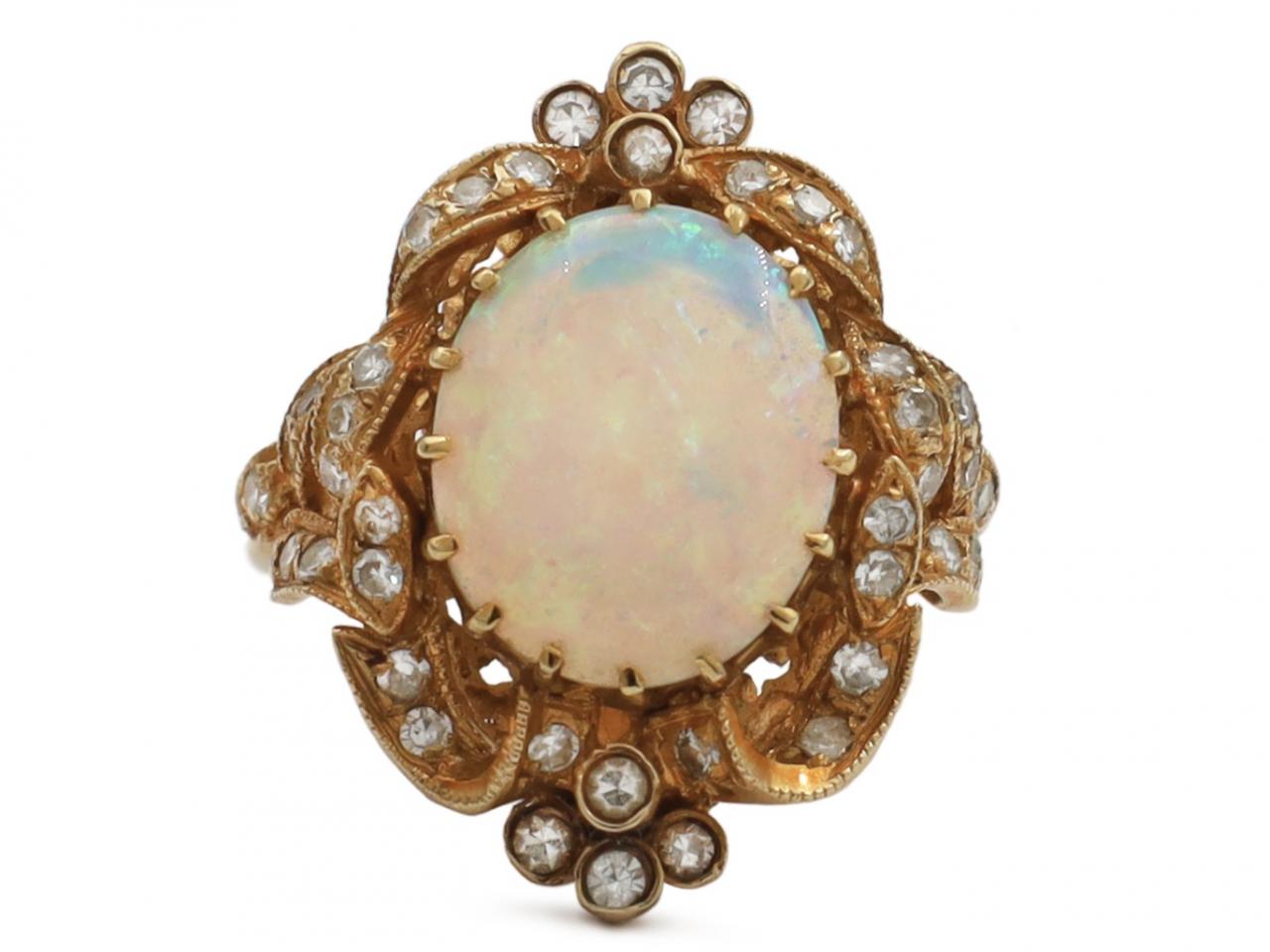 Antique style opal and diamond fancy cluster ring in 18kt yellow gold. Centrally set with an estimated 2.10ct oval cabochon opal in a raised claw setting, surrounded and flanked by round eight cut diamonds in grain and bezel settings, to an oval cluster design with folding and flowing leaf motifs with millegrain decoration and a textured and openwork gallery, met to either side with inwardly tapering shoulders, incised to the centre and broadening to a solid shank. Estimated total diamond weight 0.50cts. Marked 18kt gold.
