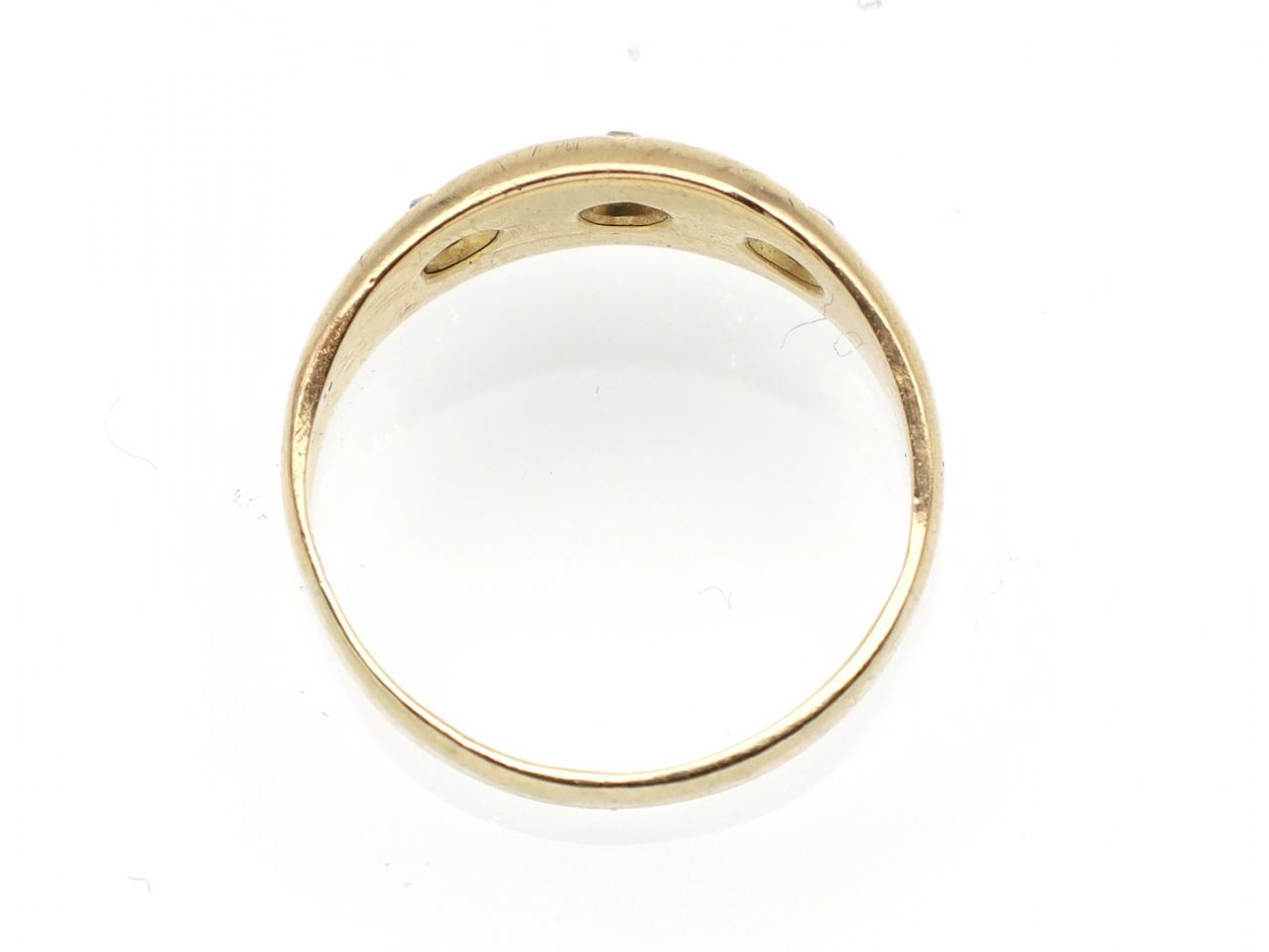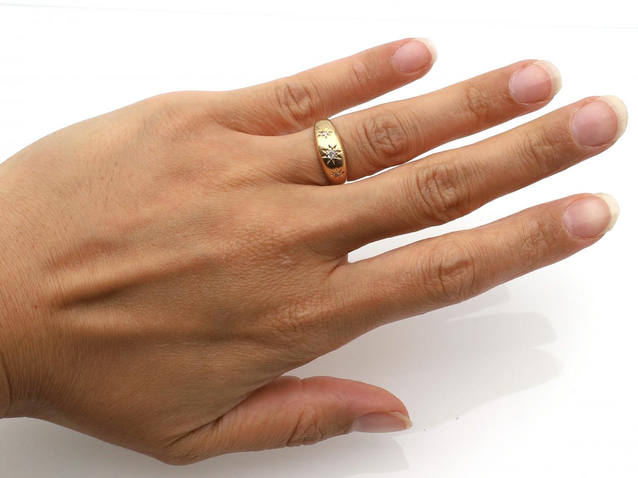 Antique three stone diamond gypsy ring in 18kt yellow gold. Set across the finger with three round eight cut diamonds in gypsy settings, to a rounded tapering band which curves to a solid shank.