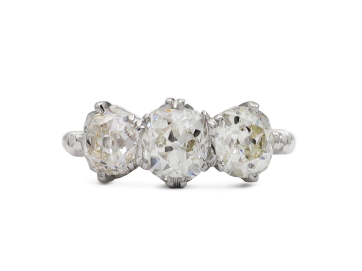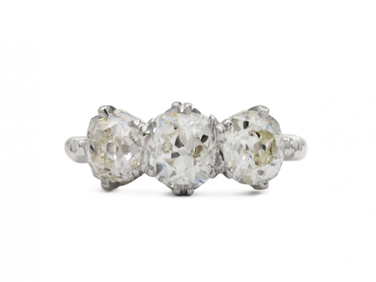 Antique three stone Old Mine cut diamond ring in platinum. Set across the finger with three cushion shape Old Mine cut diamonds in split claw settings, to a traditional three stone design with intricate claws, pierced scrolling collets and flanked to either side with raised inwardly tapering shoulders which feature ribbed terminals before smoothing to a solid shank. Estimated total diamond weight 2.00cts. Marked platinum.