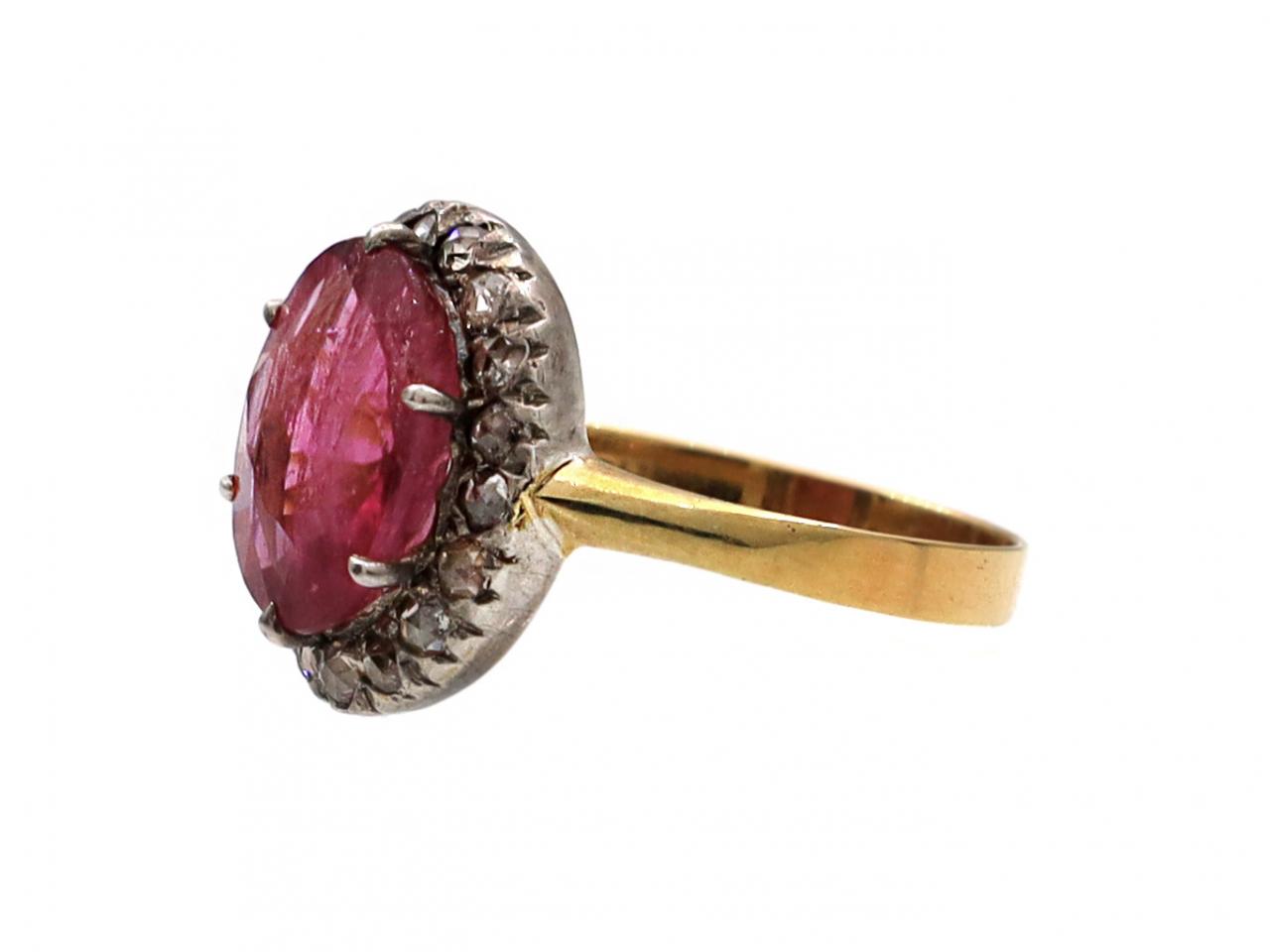 Antique tourmaline and diamond oval cluster ring in 18kt yellow gold. Centrally set with an oval mixed cut tourmaline in a slight raised claw setting, encircled by a single row of rose cut diamonds in silver cut down settings, to an oval coronet cluster design with curving claws and fitted to either side with slightly inwardly tapering shoulders which broaden to a solid shank. Marked 18kt gold.