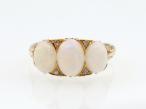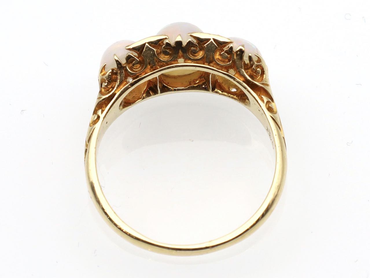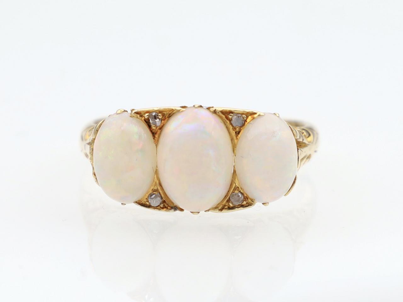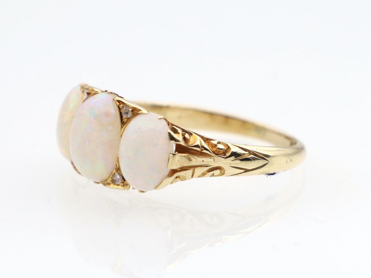 Antique white precious opal three stone carved ring in 18kt yellow gold. Set with three large oval cabochon cut white precious opal in claw and grain settings, highlighted to top and bottom with rose cut diamonds in claw settings, to an three stone with elaborately carved scrolling gallery and flanked by trumpeting shoulders decorated with carved patterns before smoothing to a solid shank. Marked 18kt gold.