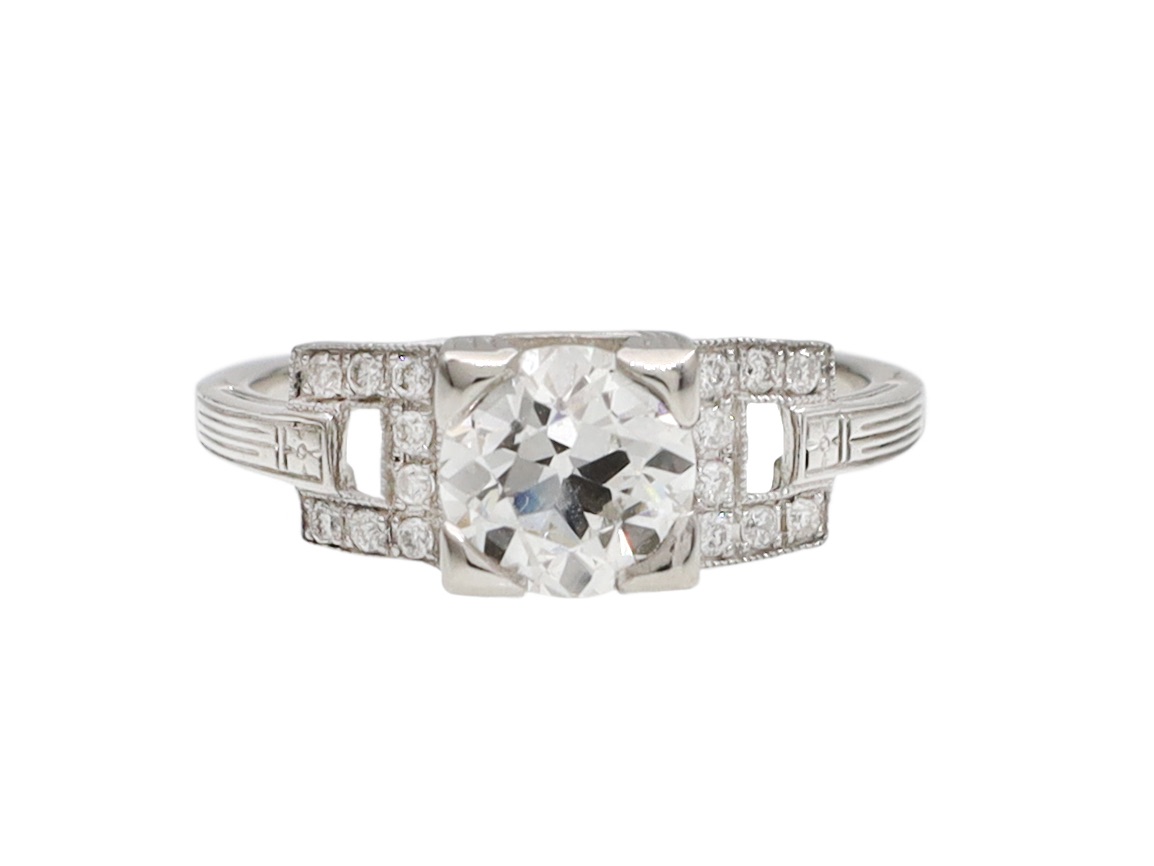 Art Deco 0.95ct diamond solitaire ring with geometric shoulders in platinum. Set with an estimated 0.95ct round transitional cut diamond in a square collet setting, to a solitaire design featuring finely engraved gallery, openwork diamond set shoulders and intricate floral motifs terminating to a solid shank.