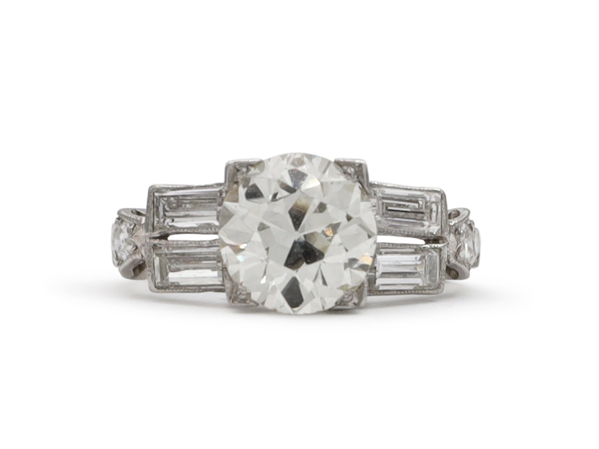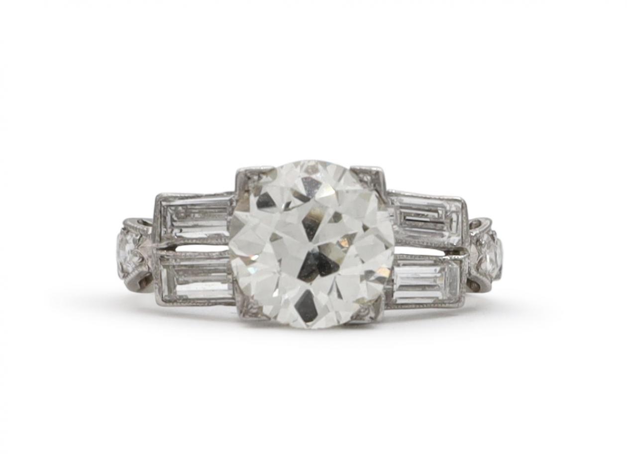 Art Deco 1.55ct round Old European cut diamond solitaire ring in platinum. Set with an estimated 1.55ct round Old European cut diamond in a square collet setting, flanked by four rectangular baguette cut diamonds in floating millegrain settings, further set with four round brilliant cut diamonds in step down grain settings, to a flanked solitaire design with structured settings, openwork gallery supported by cheniers and met to either side with split shoulders which terminate to a solid shank.
