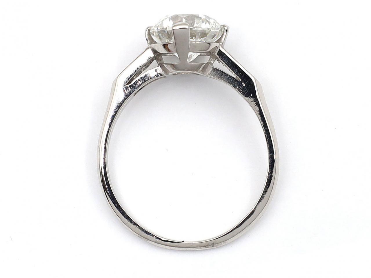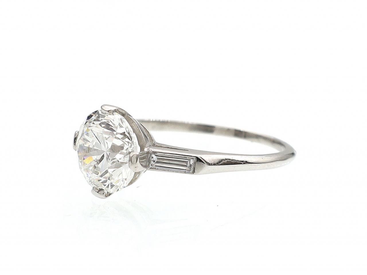 Art Deco 2.03ct round Old European cut diamond solitaire ring in platinum. Centred with a 2.03ct round Old European cut diamond, G colour, VS2 clarity, in a four claw North, South, East, West setting, flanked by horizontally set rectangular baguette cut diamonds in rubover settings, terminating to raised chevron edges that smooth to a slim shank. Accompanied by a Gemological Institute of America certificate.