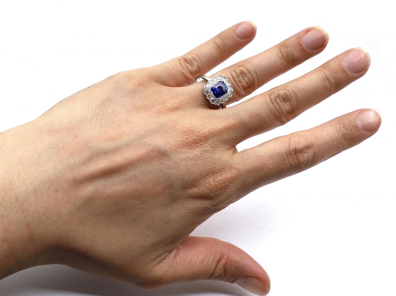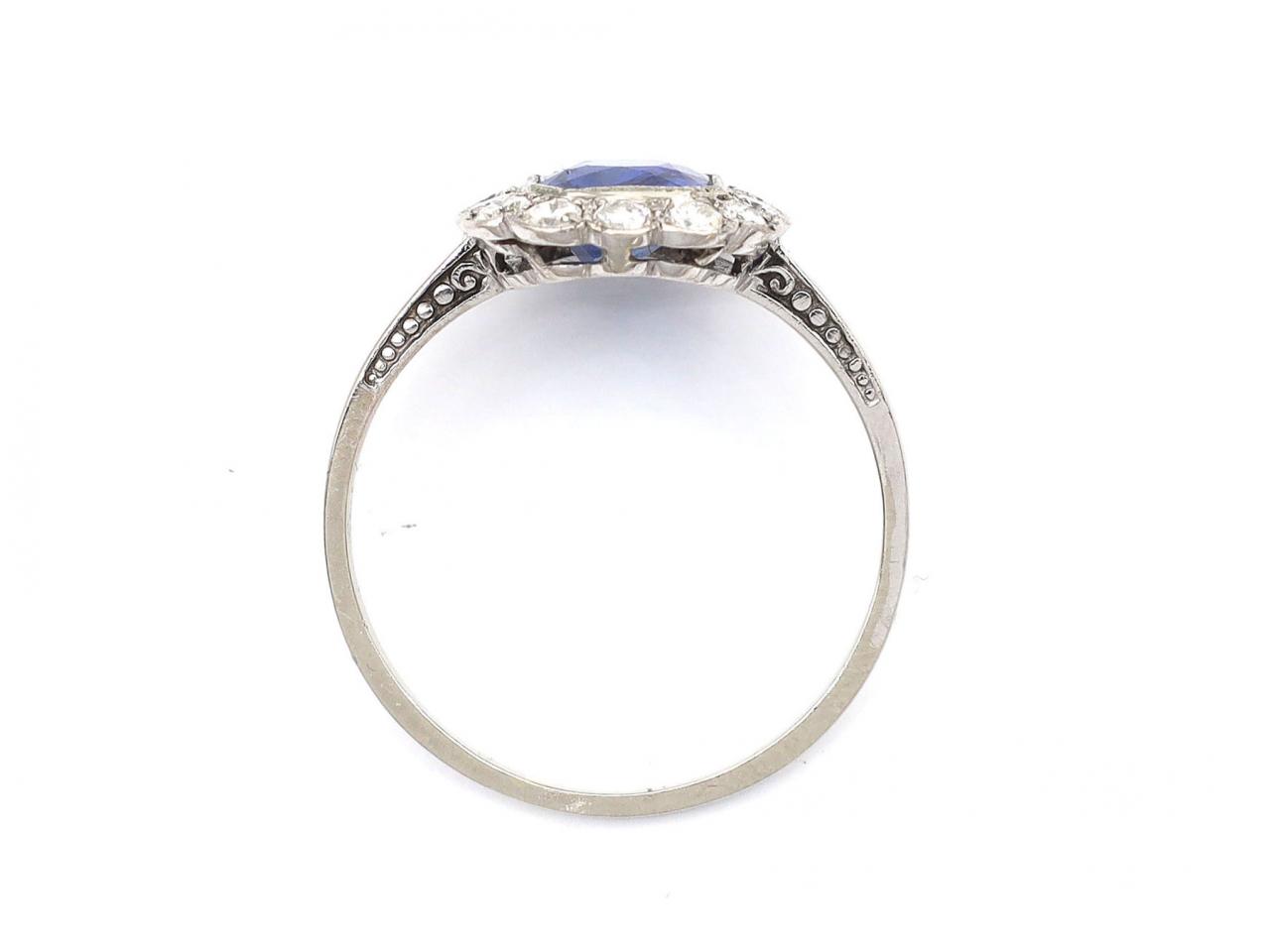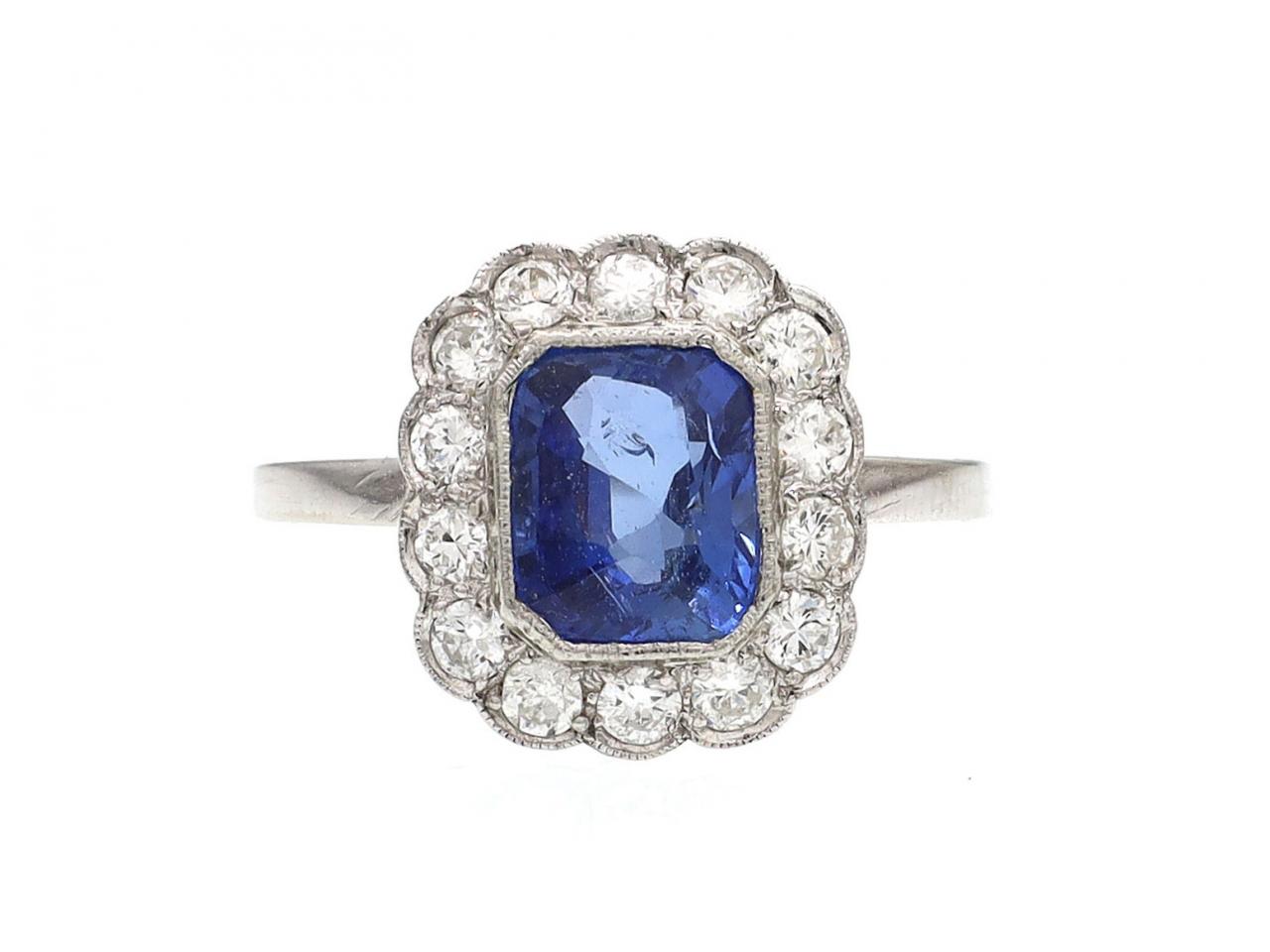Art Deco Burmese sapphire and diamond floral cluster ring in platinum. Centrally set with a 2.21ct octagonal mixed cut Burmese sapphire with no indication of heat treatment, in a millegrain setting, bordered by a row of round old cut diamonds in grain and millegrain settings, to a floral cluster design with scalloped edging, pierced gallery and square shoulders decorated to the inner with engraved details which smooths to solid shank. Accompanied by Gemmological Certification Services certificate no.80275-02.