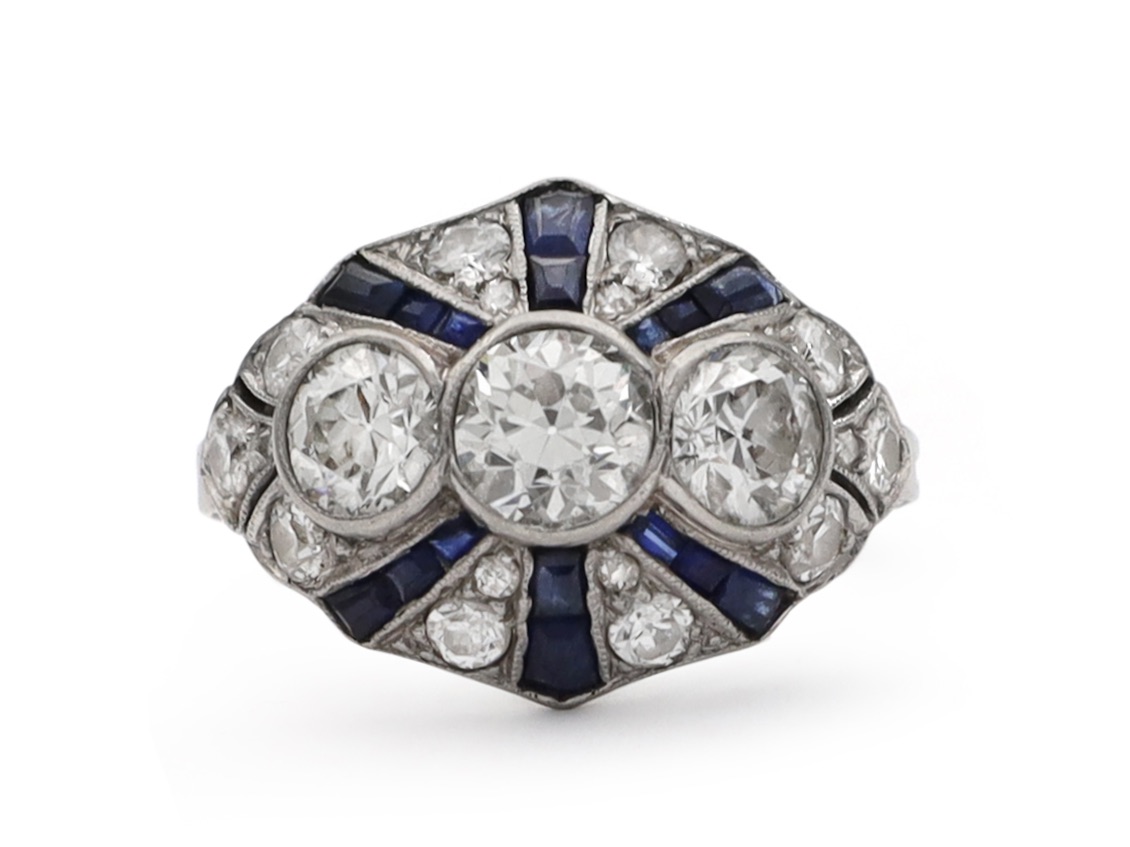Art Deco Diamond & Calibre Sapphire Bombe Cluster Ring in Platinum