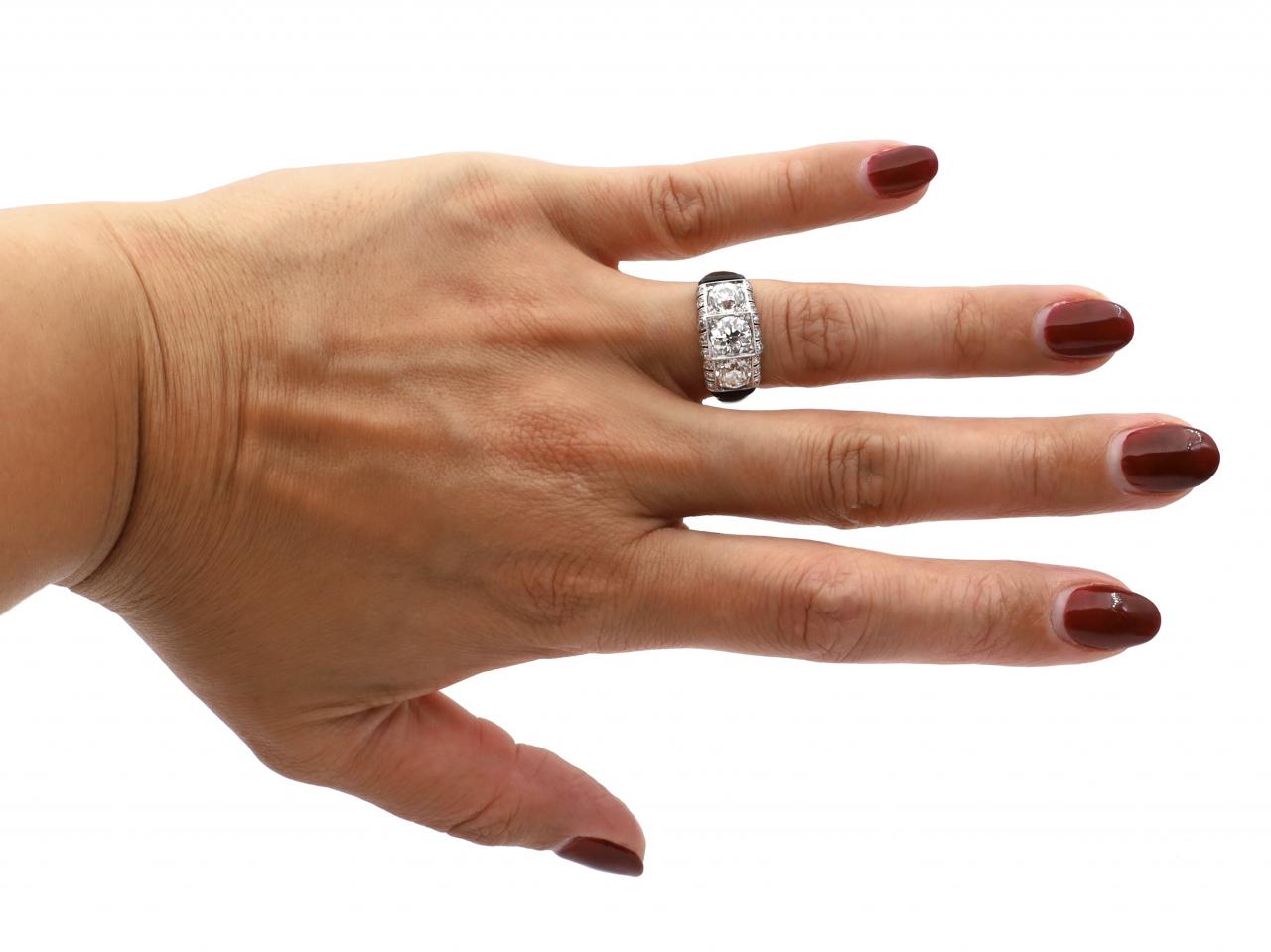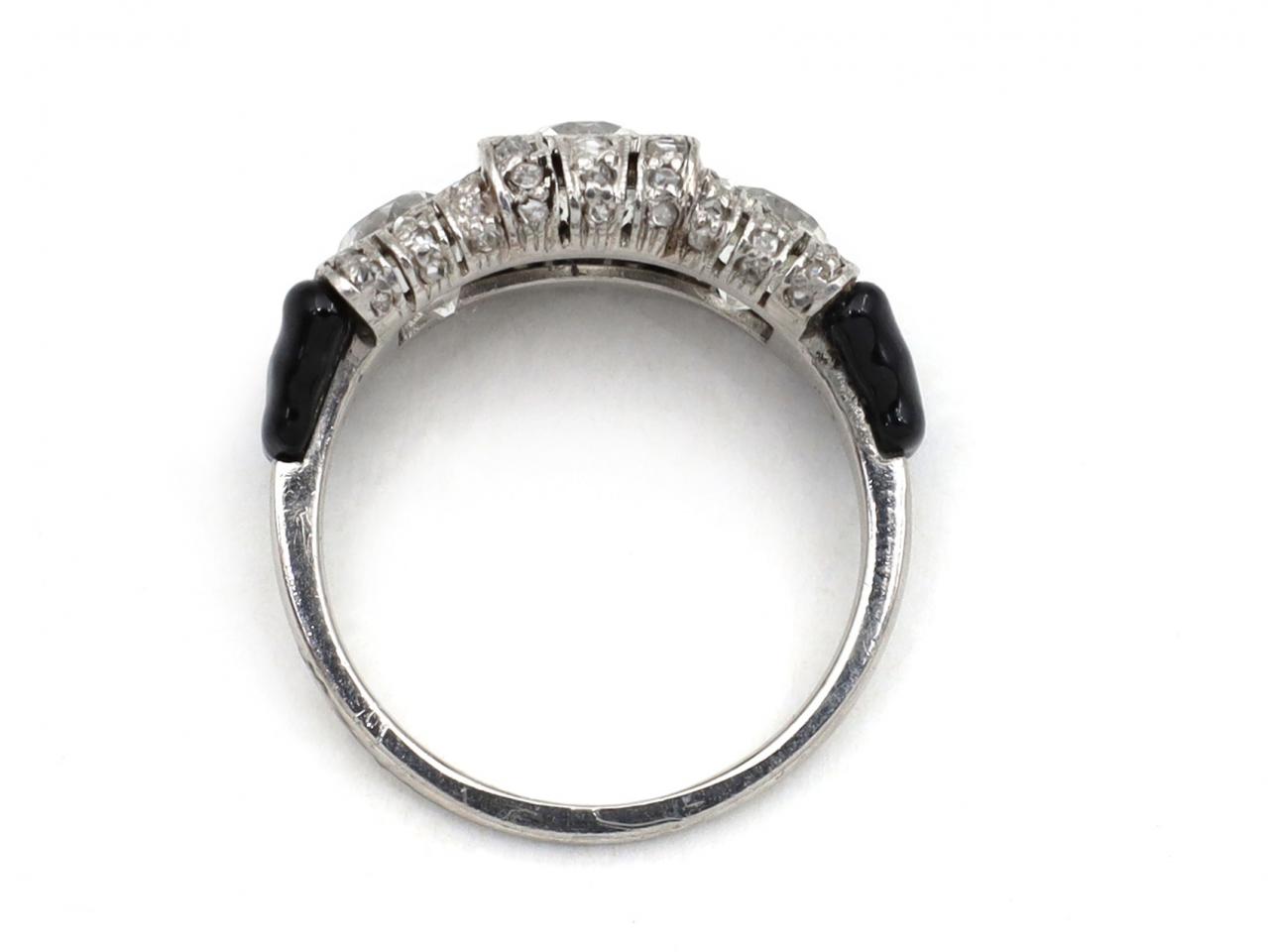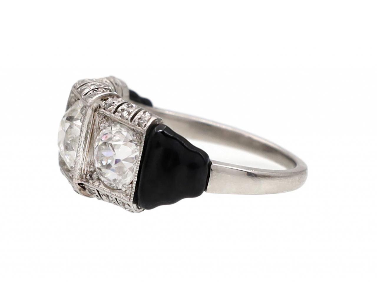 Art Deco diamond and onyx three stone ring in platinum. Centrally set with an estimated 0.70ct round old European cut diamond in a square collet setting, flanked to either side with two round old European cut diamonds in square collet settings, to a geometric three stone, decorated to top and bottom with curved linear terminals set with rose cut diamonds and flanked to either side with carved onyx shoulders which smooth to a solid shank.