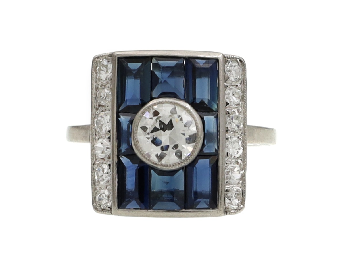 Art Deco diamond and sapphire rectangular target plaque ring in platinum