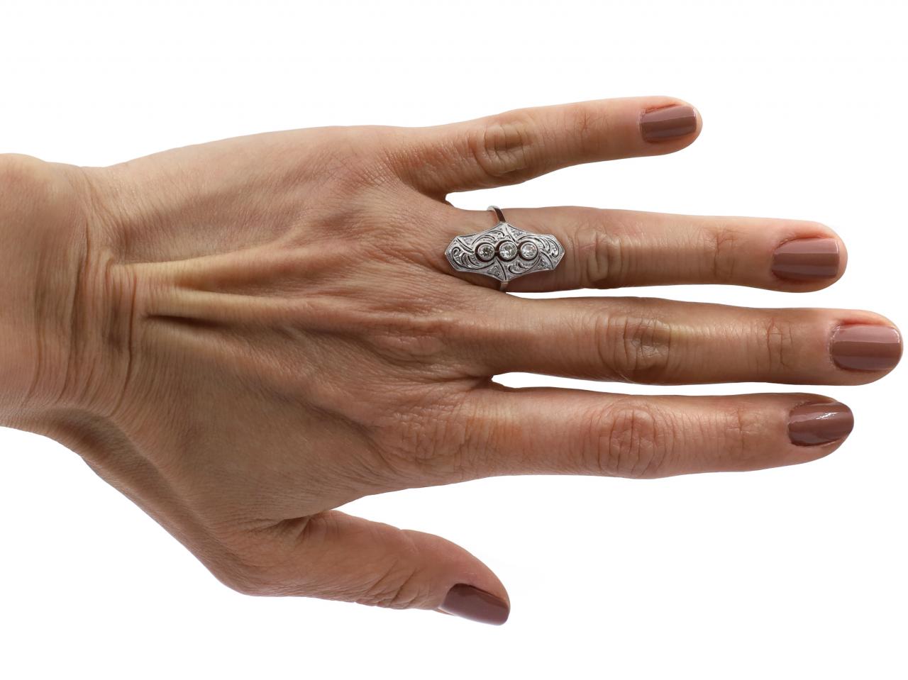 Art Deco diamond set shield ring set in platinum on 14kt gold. Vertically set with three round old cut diamonds in millegrain settings, to an openwork shield decorated with rose cut diamonds in grain settings with a pierced linear gallery, flanked to either side with finely trumpeted shoulders which curve to a slim shank. Marked 14kt gold.