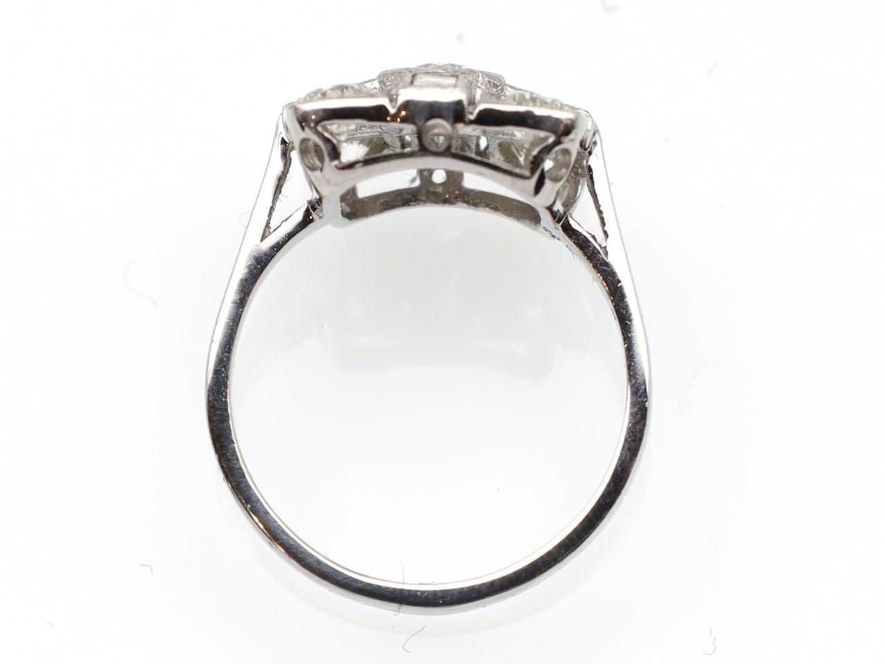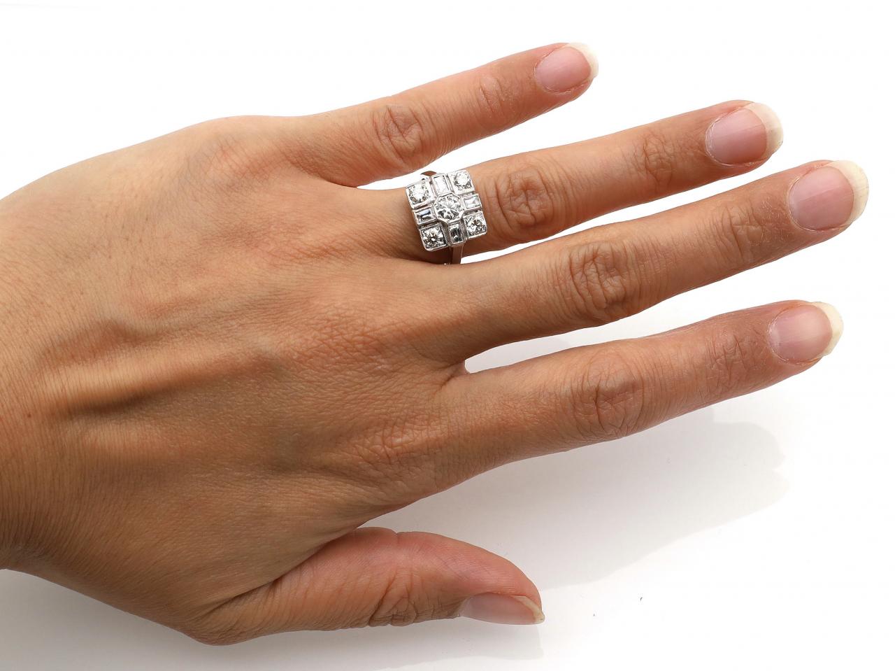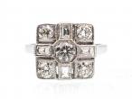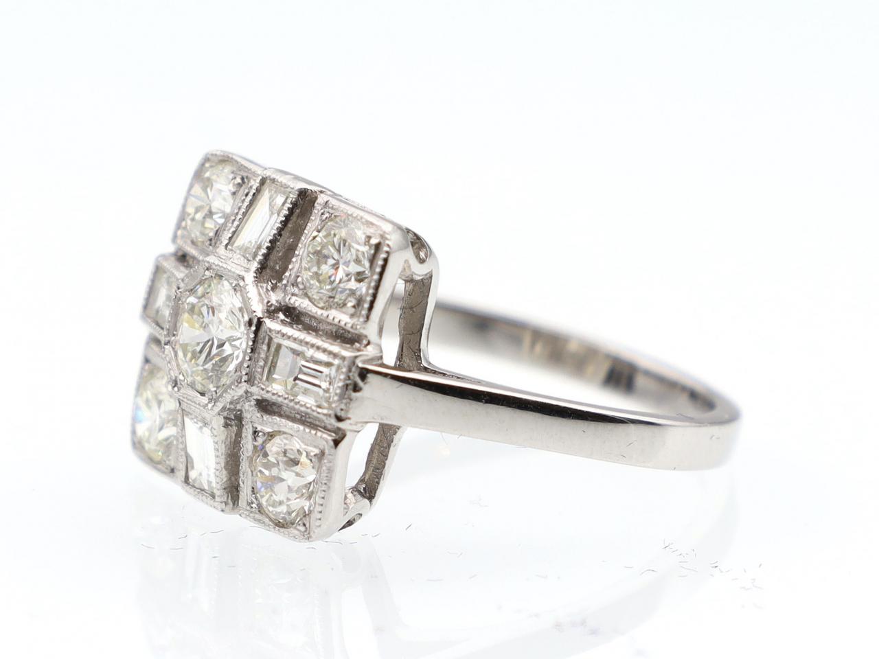 Art Deco style diamond square cluster ring in platinum. Centrally set with a 0.40ct round Old European cut diamond in a slightly raised octagonal collet setting, set to north, south, east and west with rectangular step cut diamonds in millegrain settings and further enhanced with round Old European cut diamonds in grain settings, to a geometic cluster outlined with millegrain edging and supported by an chenier detailed gallery and flanked to either side with raised square shoulders which curve to a solid shank. Estimated total diamond weight 1.40cts. Marked platinum.