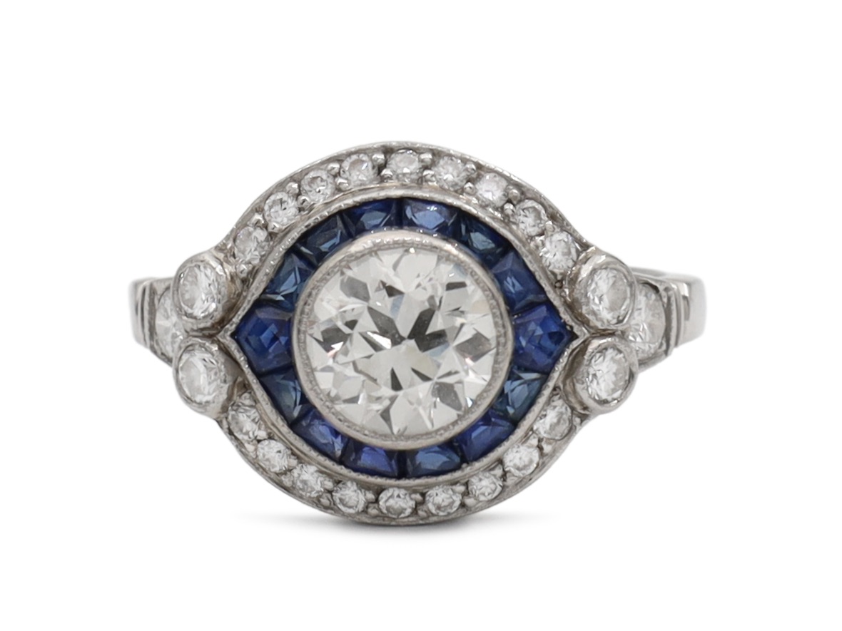 Art Deco style double row diamond and sapphire target ring in platinum. Centred with an estimated 0.95ct round brilliant cut diamond in a raised millegrain setting, framed by a row of callibre cut sapphires in channel settings, further enhanced by a row of round brilliant cut diamonds in grain and millegrain settings, to a bombe cluster ring with millegrain edges and subtle pierced gallery, flanked b y diamond set shoulders with ribbed terminals before smoothing to a solid shank.