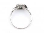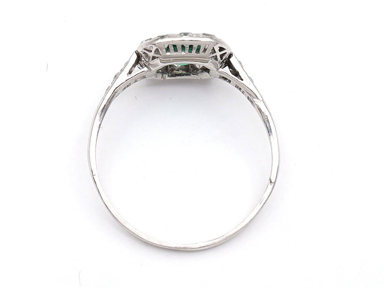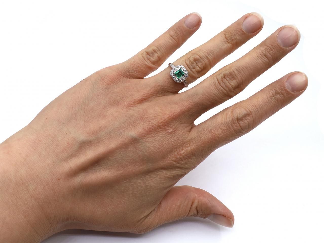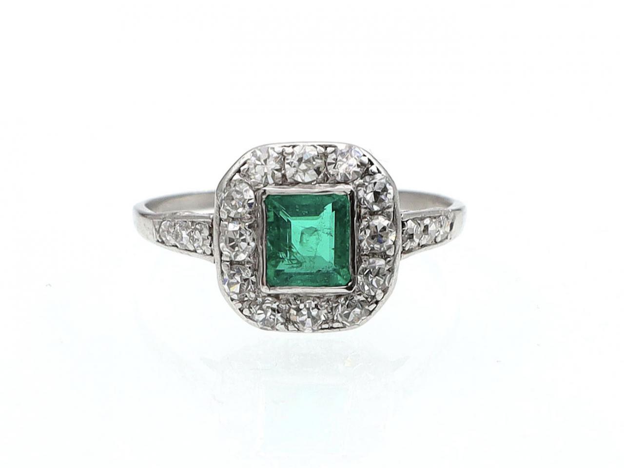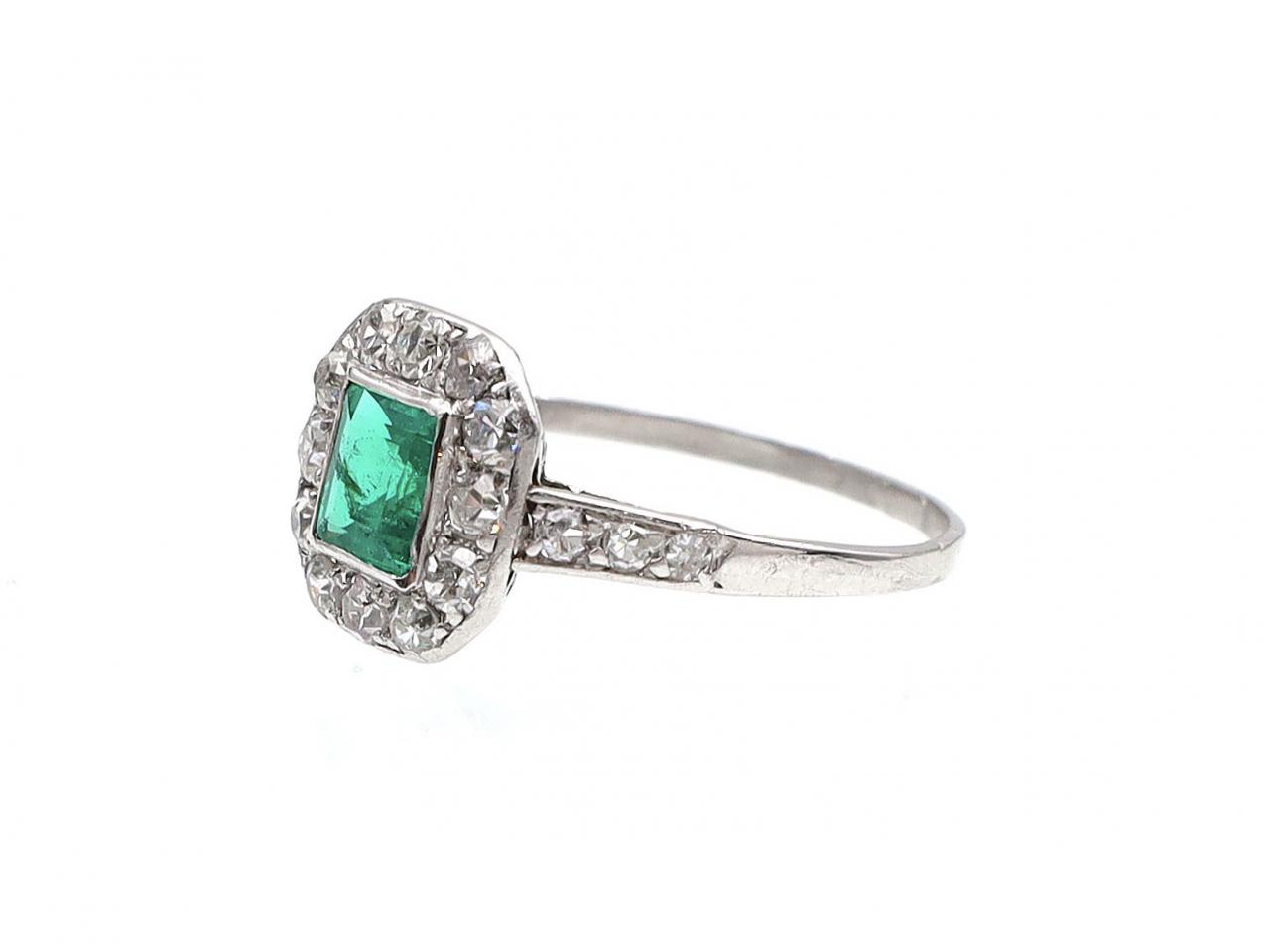 Art Deco emerald and diamond octagonal cluster ring in platinum. Set with a square step cut emerald in a rubover setting, framed by a row of round old cut diamonds in grain settings, to a geometric cluster design with polished edges and pierced architectural gallery, flanked by diamond set shoulders which terminate to a smooth shank.