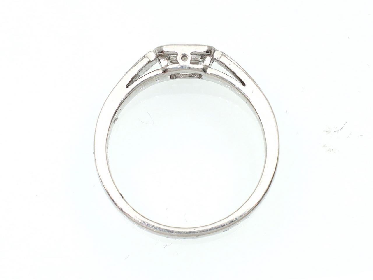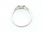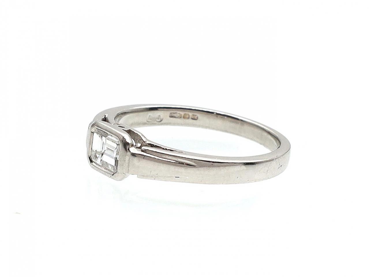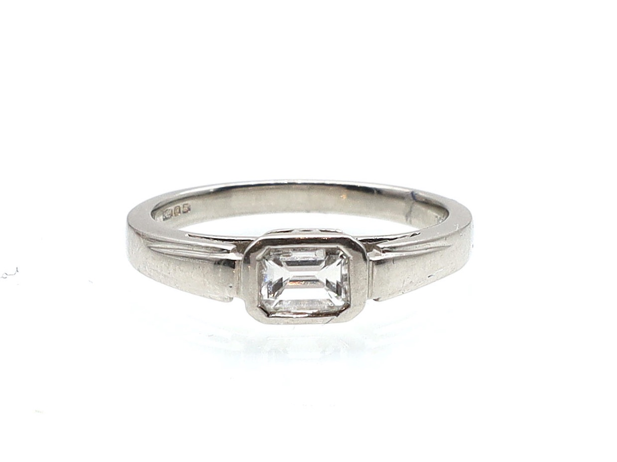 Art Deco emerald cut east to west diamond solitaire in platinum. Set with a 0.50cts octagonal emerald cut diamond in an east to west rub over setting, to an open gallery supported by cheniers and flanked by architectural trumpeting shoulders which curve to a solid shank. Hallmarked platinum.