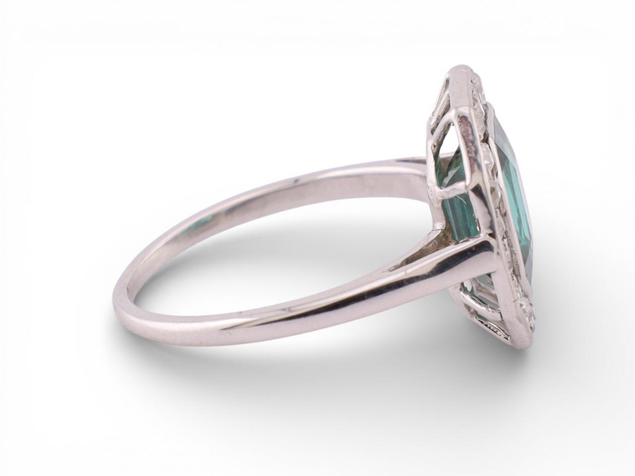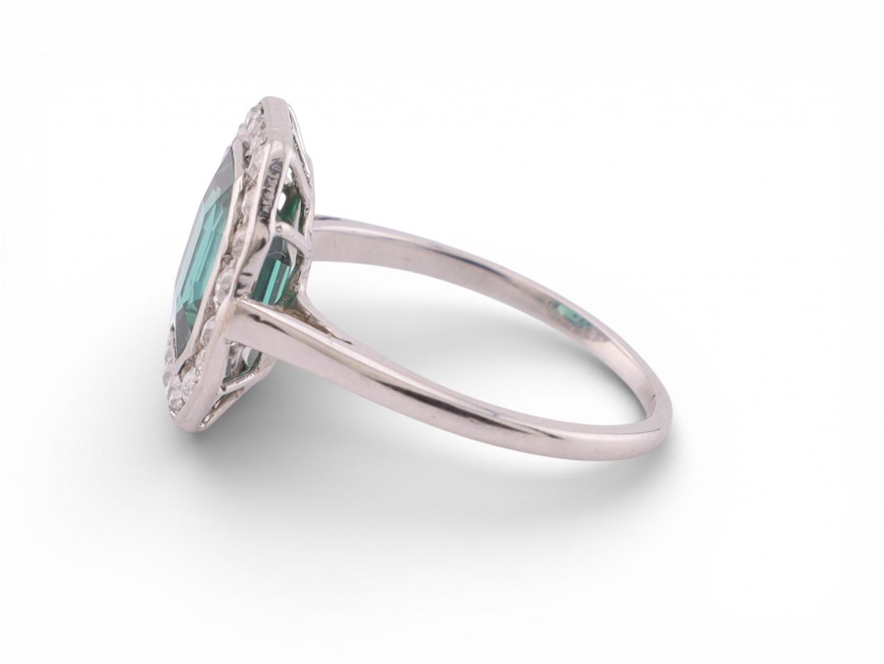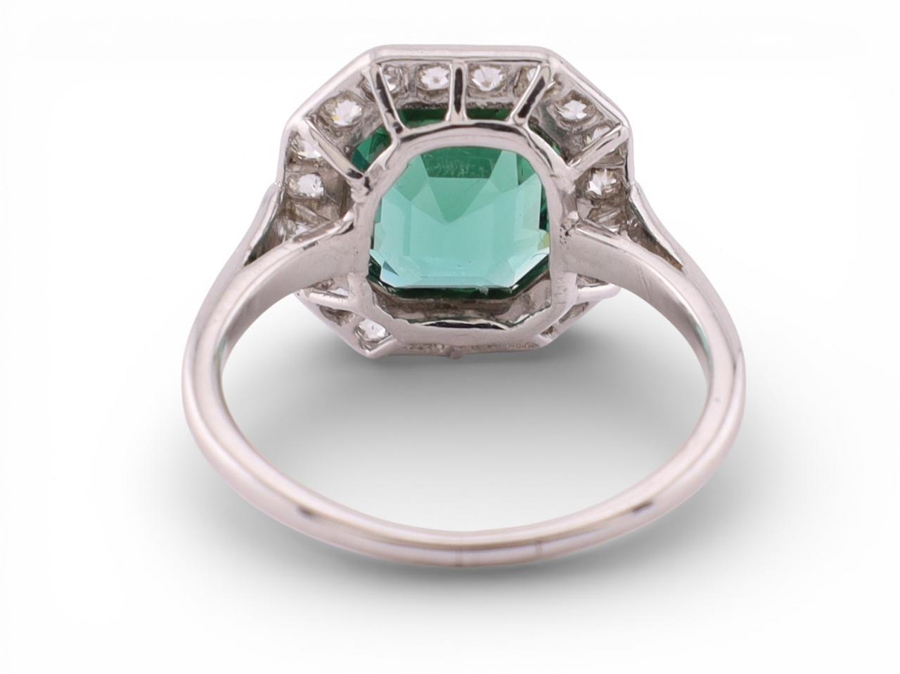 An elegant Art Deco period ring set in platinum and centred with a vivid emerald cut green tourmaline. The stone is framed by a precise octagonal halo of old cut diamonds, creating a bold geometric profile typical of the late 1920s and early 1930s. The clean lines and restrained palette highlight the craftsmanship of the period.
