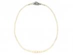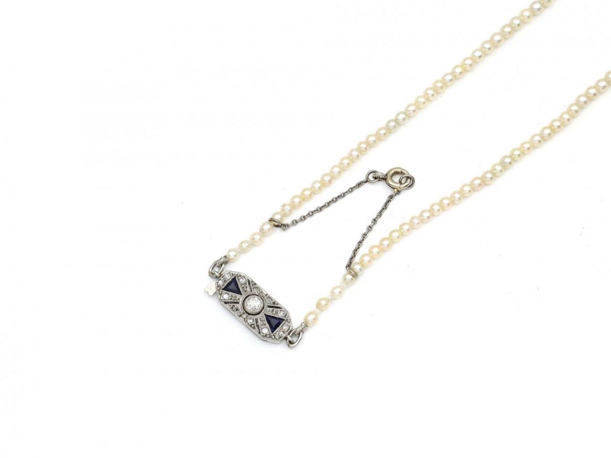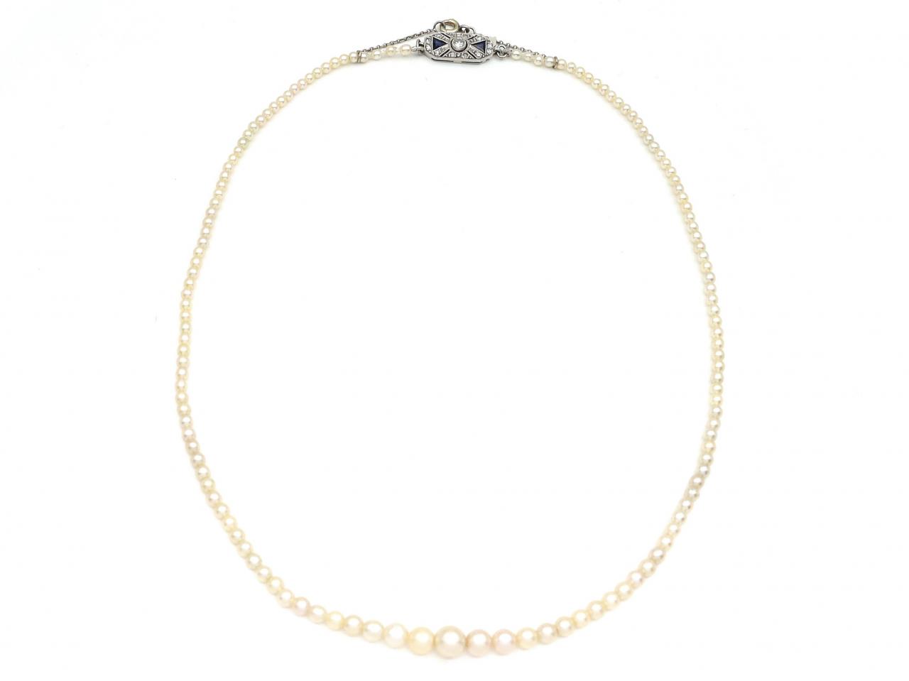 Art Deco natural pearl graduating necklace with diamond and sapphire clasp