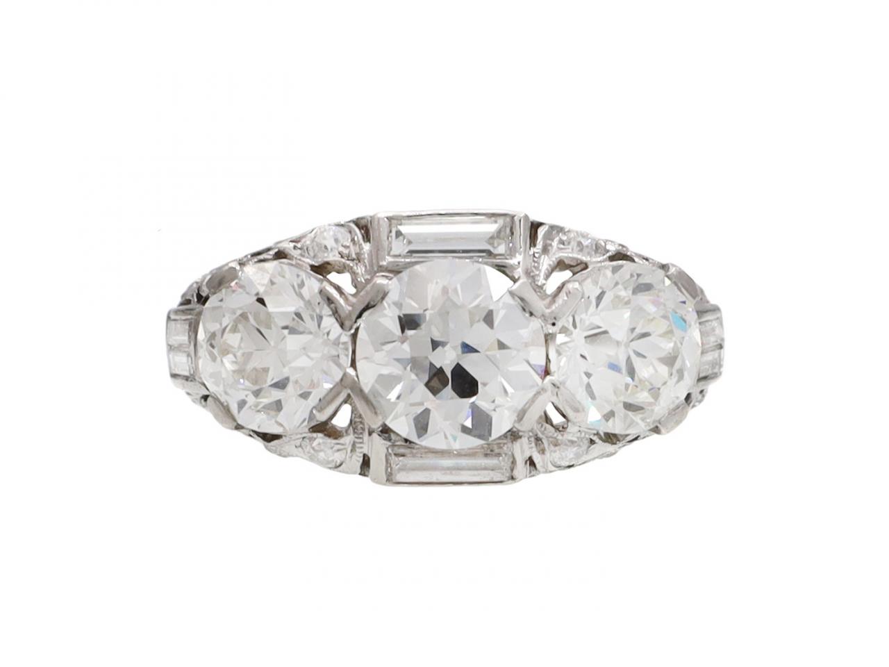 Art Deco Old European cut diamond three stone platinum ring. Centrally set with a 1.22ct round Old European cut diamond, G colour, VS1 clarity in a stylised four claw setting, flanked by a 0.97ct round Old European cut diamond, I colour, VVS2 clarity in a slightly raised four claw setting and a 0.96ct round Old European cut diamond, H colour, VS1 clarity in a four claw setting, to a graduating three stone design, decorated throughout with round old cut diamonds and embellished to top and bottom with two rectangular baguette cut diamonds in rubover settings, further enhanced with a intricately pierced gallery featuring scroll work and leaf motifs, highlighted by millegrain edging which continues on the trumpeting shoulders and terminates to a solid shank. Marked platinum and iridium, American. Accompanied by three Gemological Institute of America (GIA) certificates.