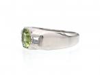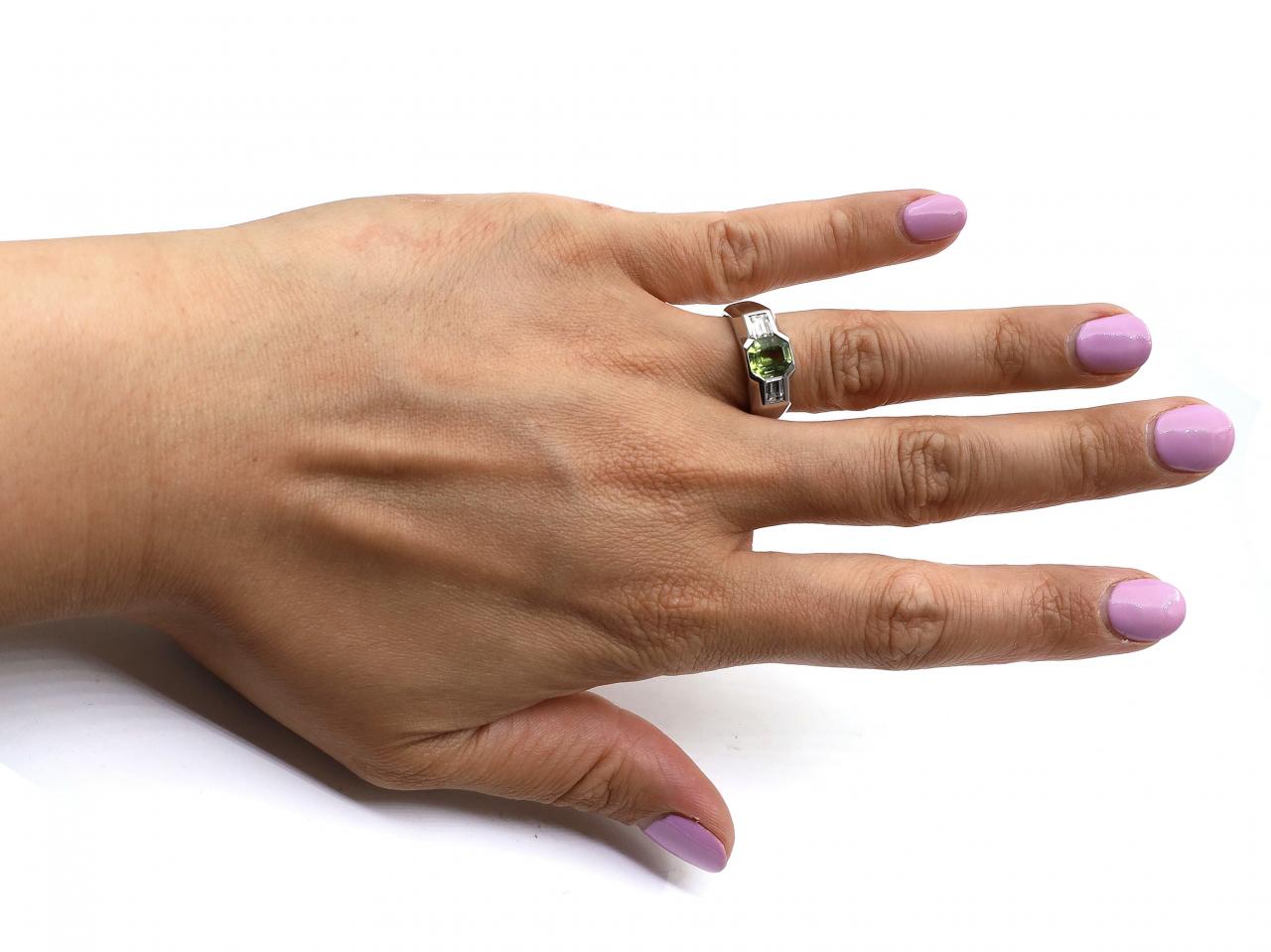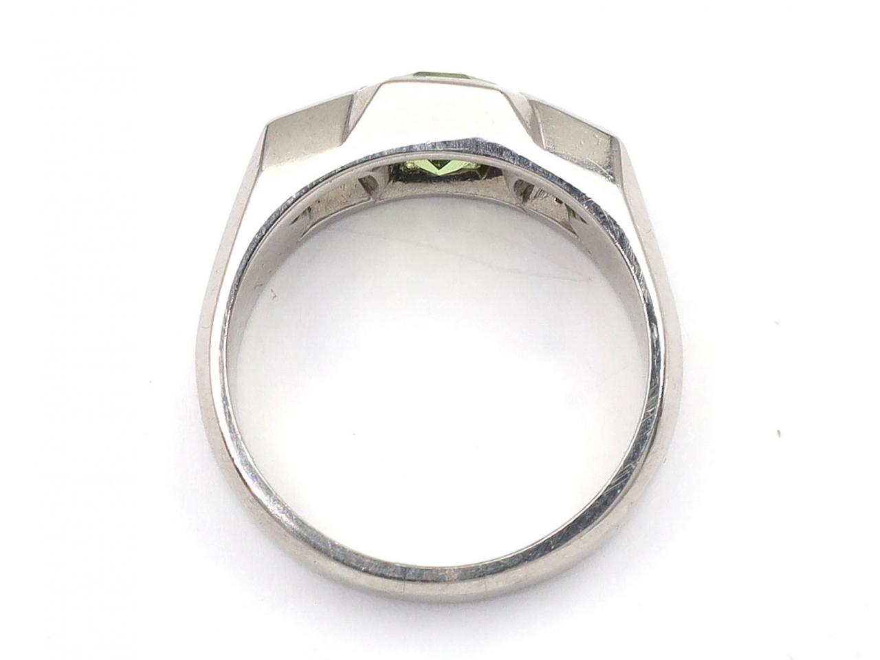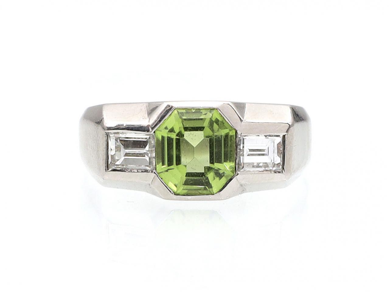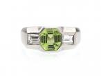Art Deco peridot and diamond three stone ring in platinum. Centred with an octagonal step cut peridot in a rubover and channel setting, flanked by two rectangular baguette cut diamonds in rubover and channel settings, to a stylish graduating three stone design with angular settings, polished finish, broad integrated shoulders and solid shank.