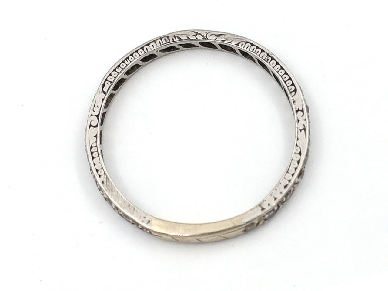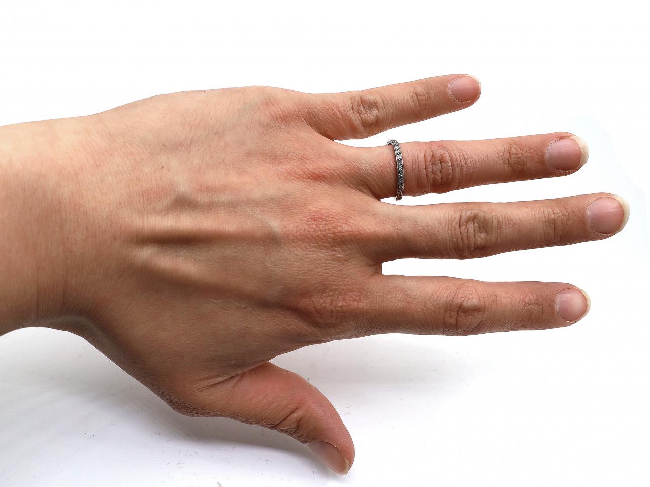 Art Deco platinum and diamond eternity ring. Set with round eight cut diamonds in grain settings, subtle engraved inner and small shank to the reverse.