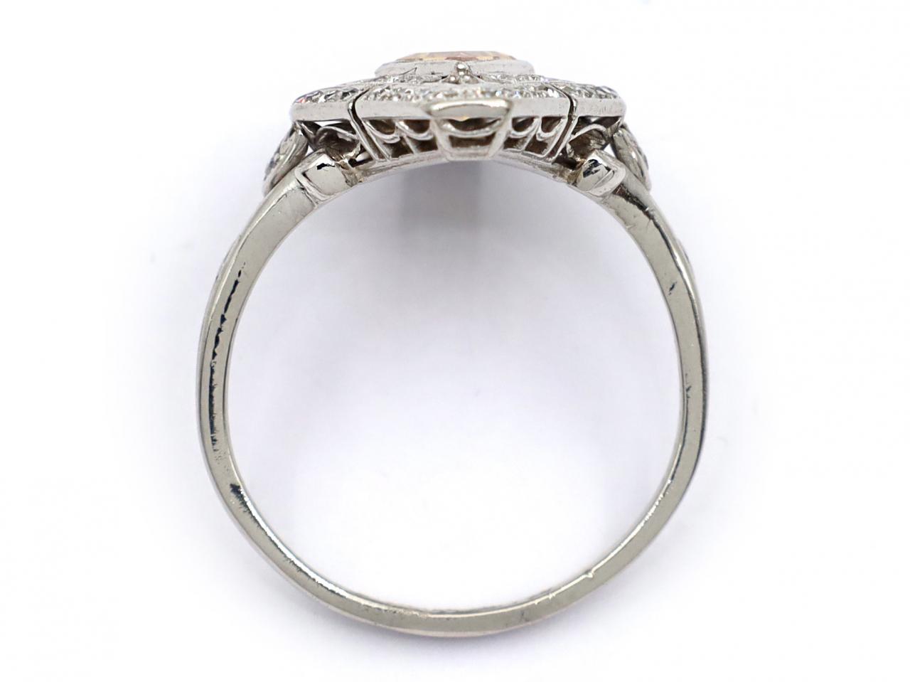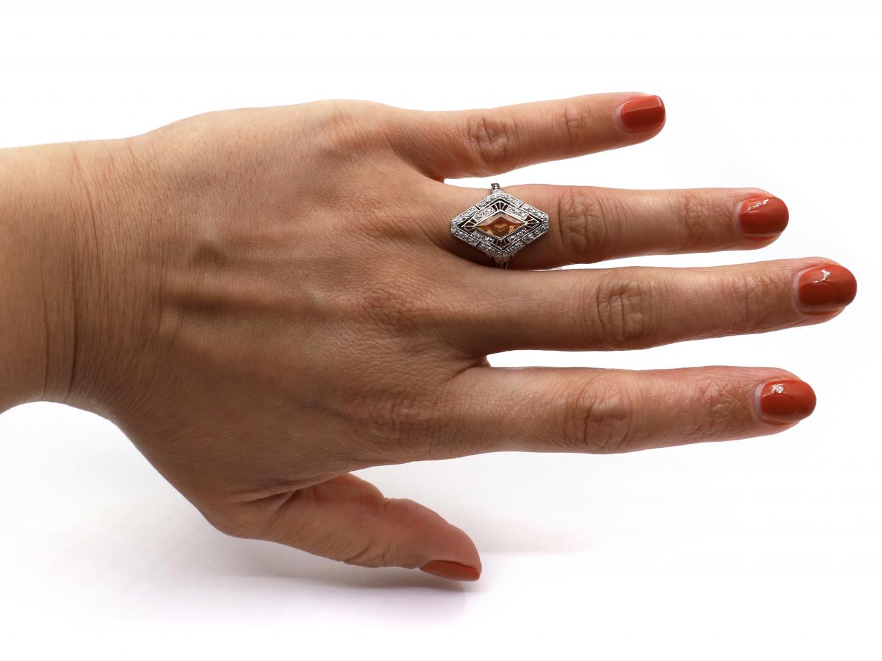 Art Deco platinum lozenge Imperial topaz and diamond cluster ring. Centrally set with a lozenge shape fancy cut Imperial topaz in a millegrain setting, surrounded by a double row of round diamonds in grain and rubover settings, to an angular openwork cluster with fancy linear fans and open scalloped gallery, flanked to either side with trumpeting tri-split shoulders intricately decorated with diamonds and terminating to a ribbed shank.