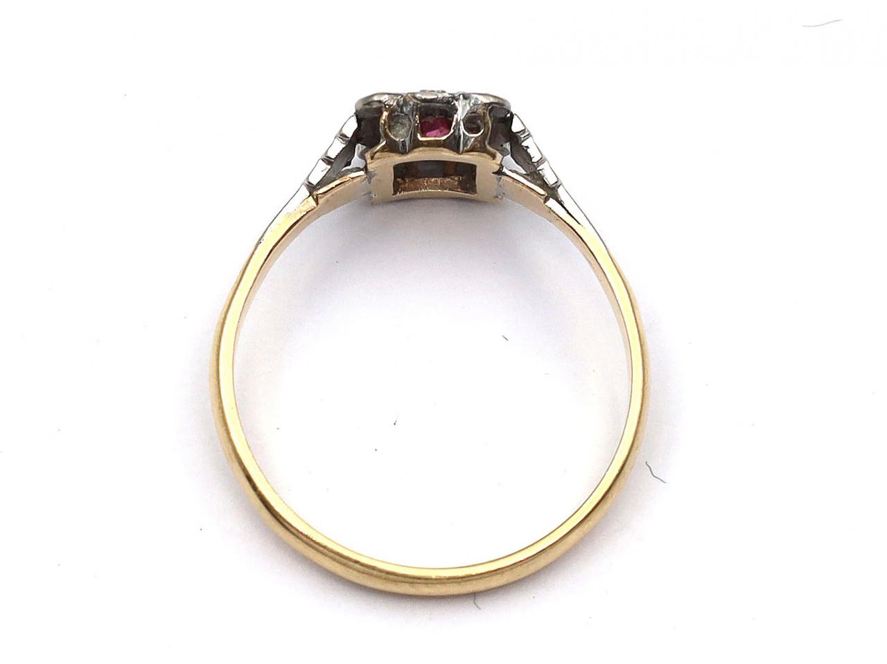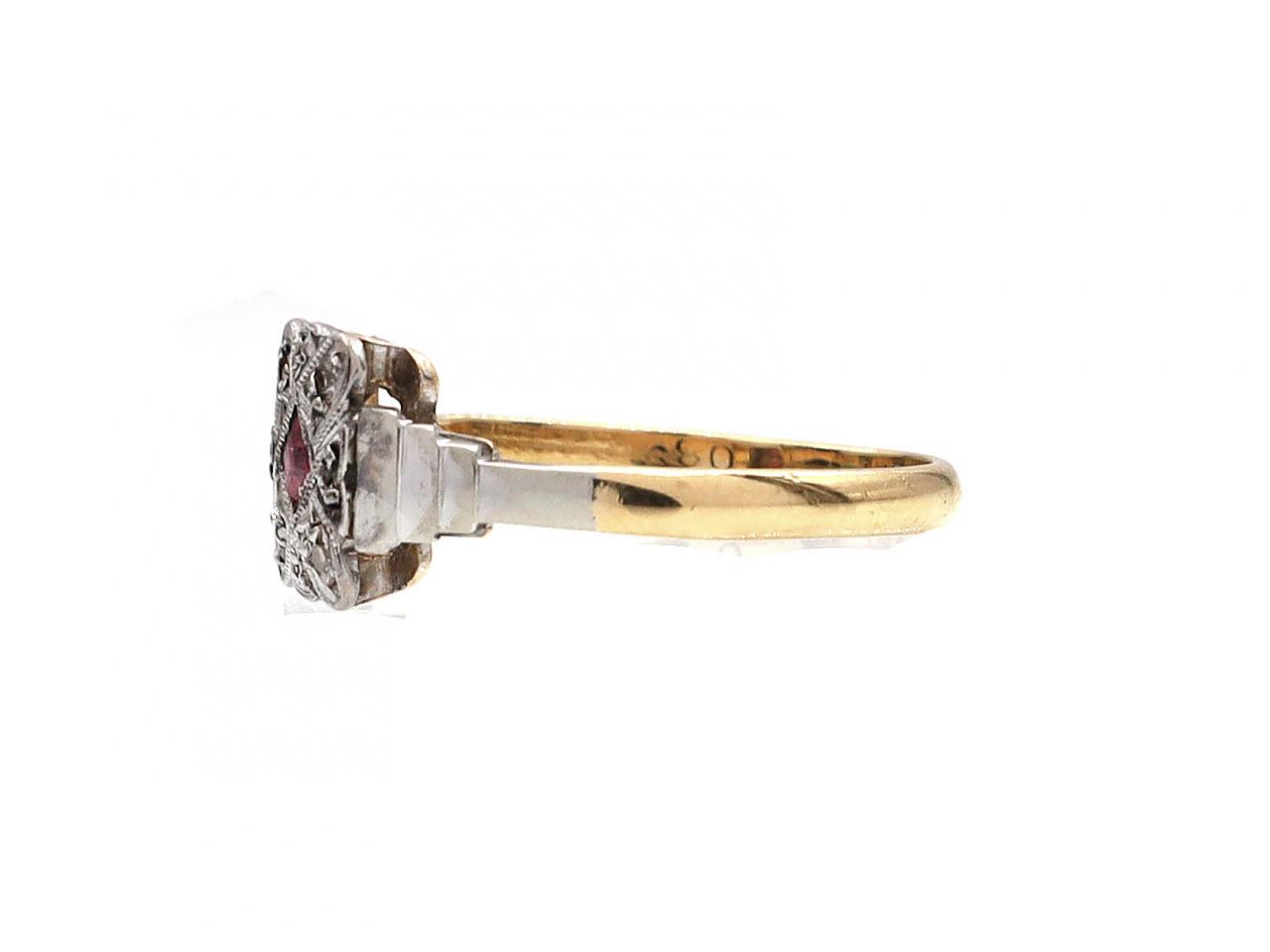 Art Deco ruby and diamond rectangular plaque ring in platinum and 18kt yellow gold. Centrally set with a squaremixed cut ruby in a millegrain setting, to a stylised rectangular plaque embellished with old cut diamonds in grain settings and decorated with borders of millegrain, flanked to either side with platinum step shoulders which terminate to a solid yellow gold shank. Marked 18kt gold and platinum.