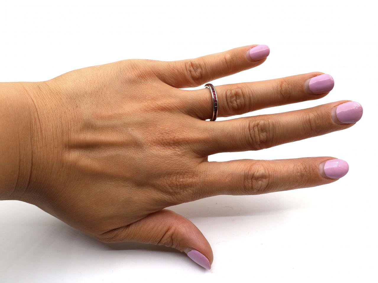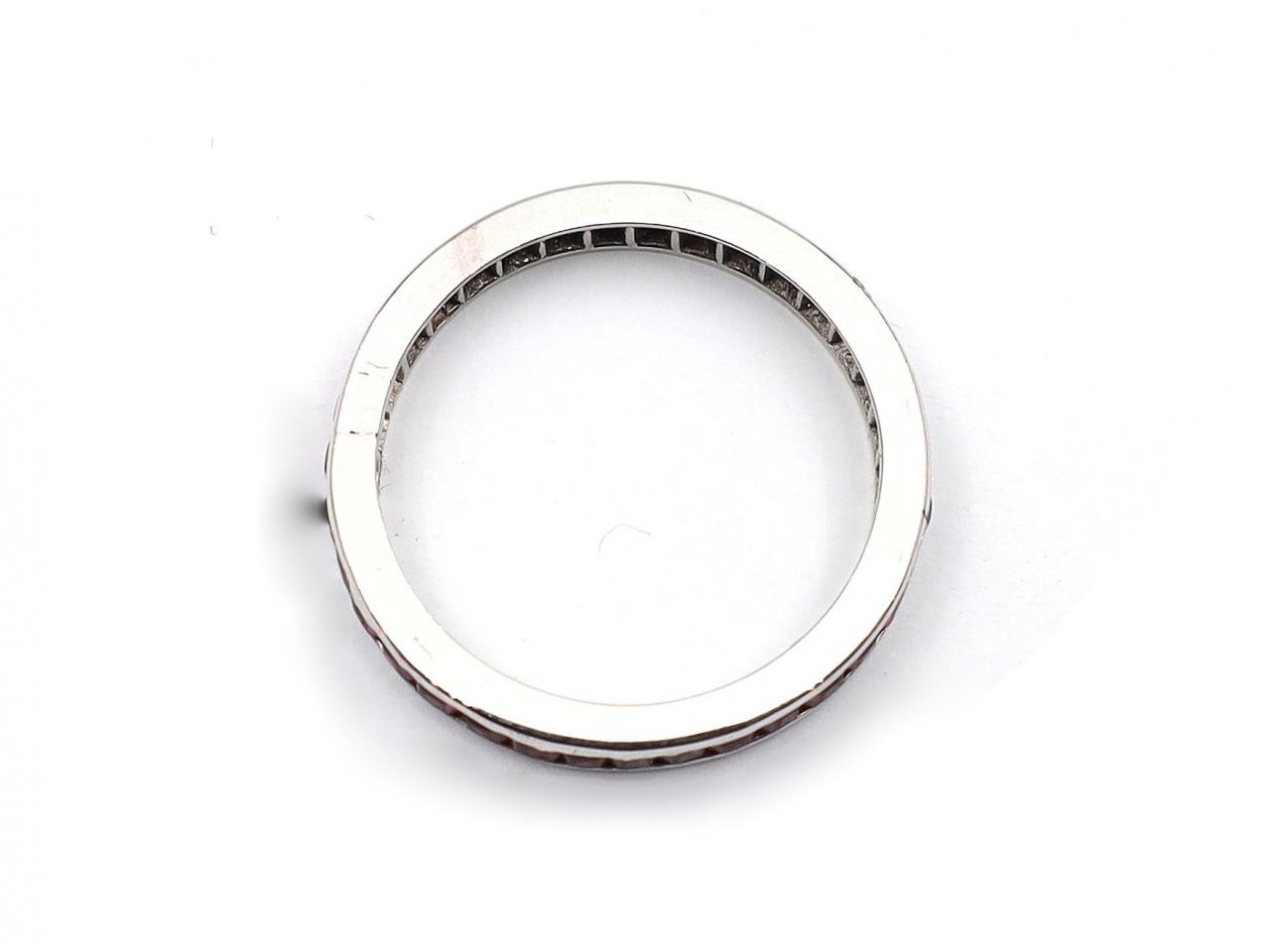 Art Deco ruby channel set full eternity ring in platinum. Set around the full circumference with square step cut rubies in channel settings with polish parallel borders. Size: M 1/2.