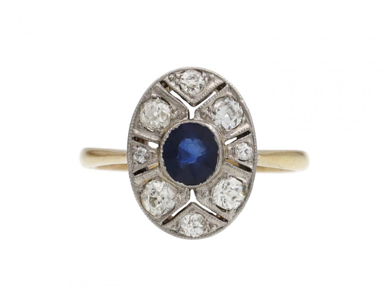 Art Deco sapphire and diamond fancy oval cluster ring in platinum and 18kt yellow gold. Centred with a round star top cut sapphire in a platinum millegrain setting, surrounded by eight old cut diamonds in platinum openwork grain settings, to an oval cluster design with millegrain borders and pierced gallery, flanked to either side with inwardly tapering shoulders which smooth to a solid shank. Marked 18kt gold and platinum.