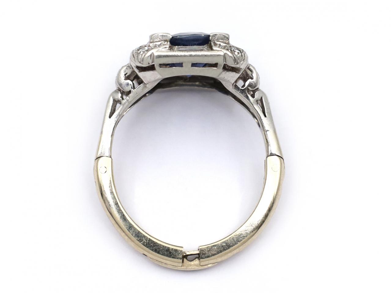Art Deco sapphire and diamond square cluster ring in platinum and 18kt white gold. Centrally set with a cushion shape mixed cut sapphire in a four claw setting, bordered by rectangular baguette cut and round old cut diamonds in grain settings, to a geometric cluster with stylised claws, polished borders and pierced linear gallery, flanked to either side with diamond set trumpeting shoulders which terminates to a slim shank.