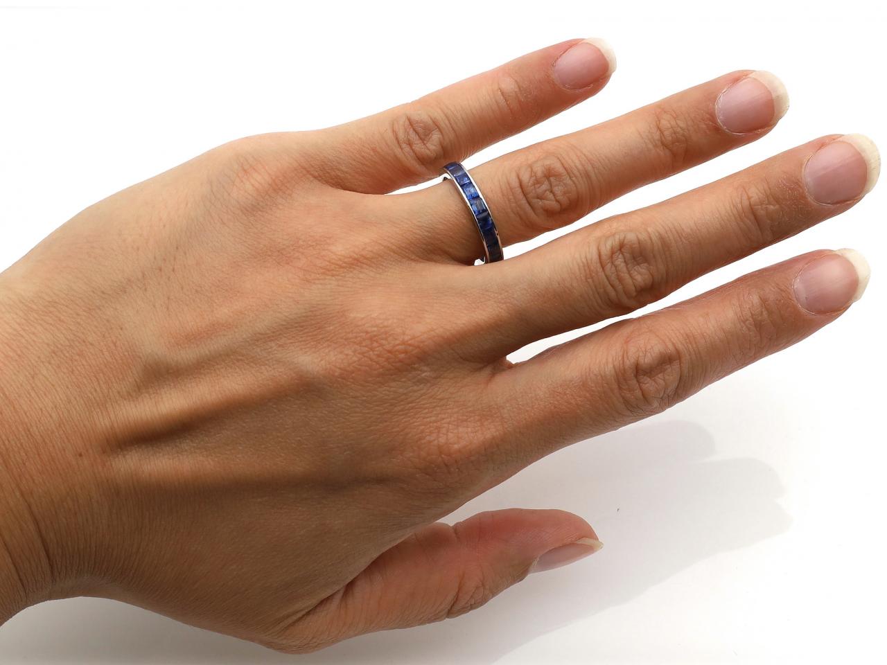 Art Deco sapphire full eternity ring in platinum. Set with square step cut sapphires in channel settings with polished borders. Tested platinum. Size N.