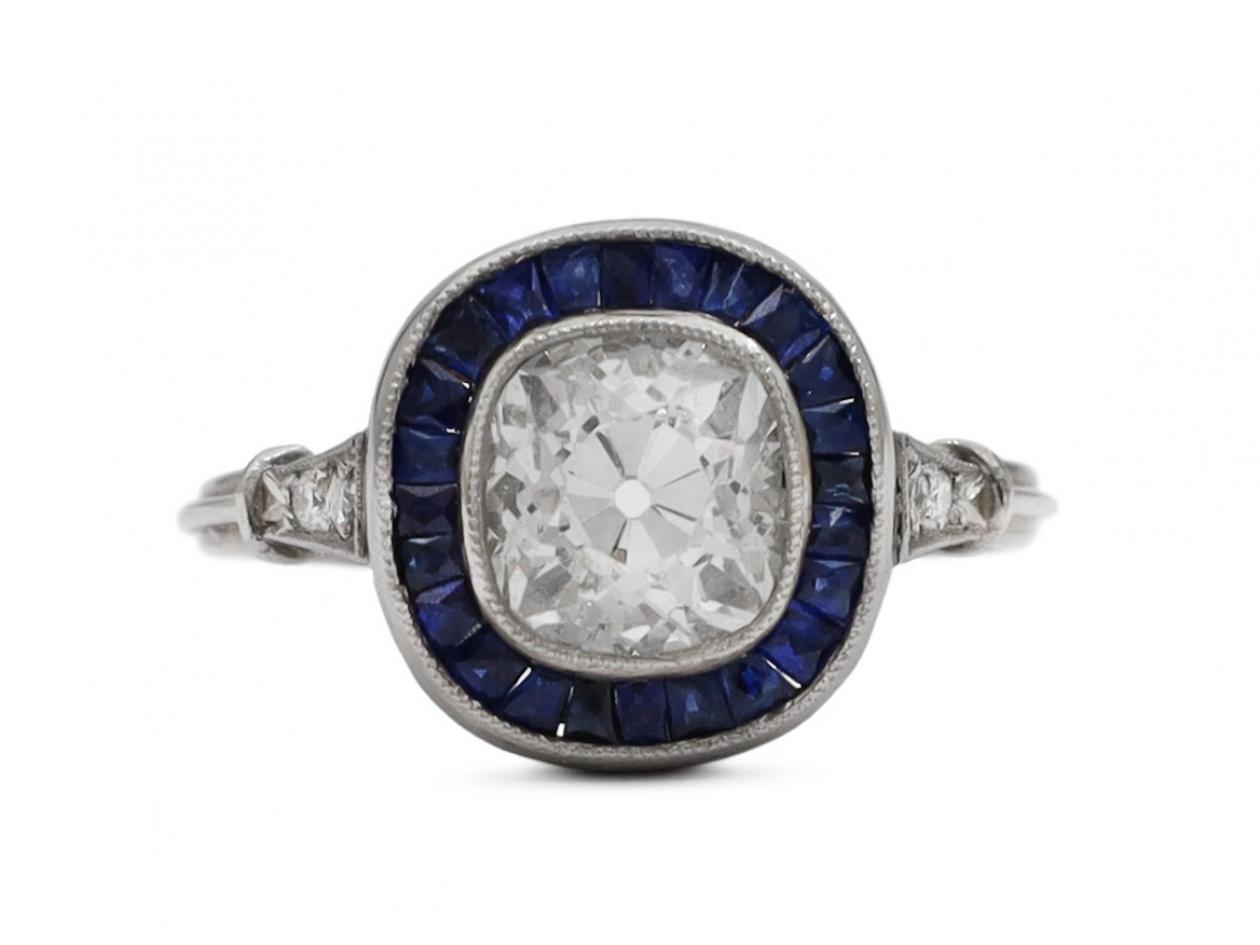 Art Deco style 1.32ct Old Mine diamond and sapphire target ring