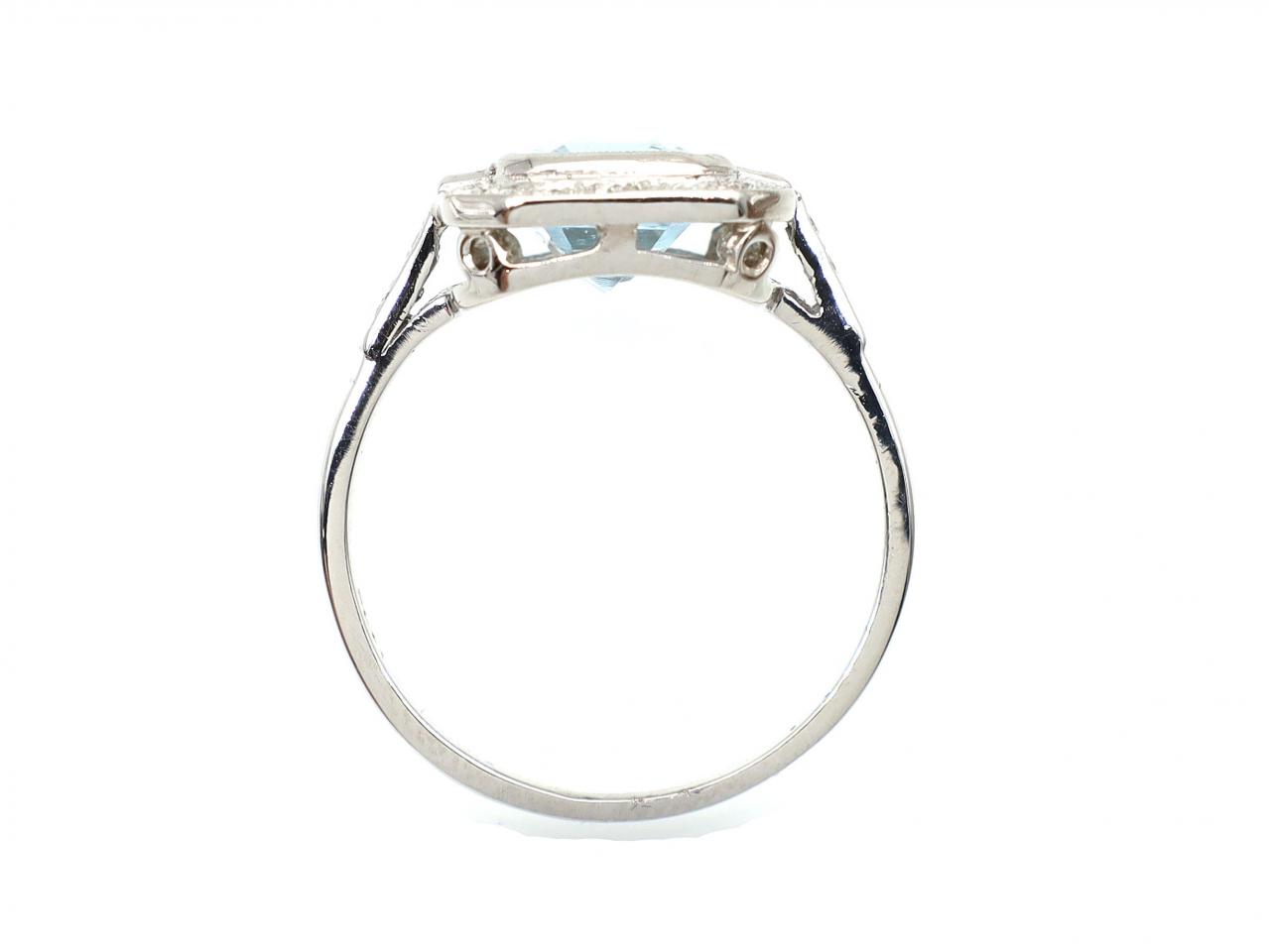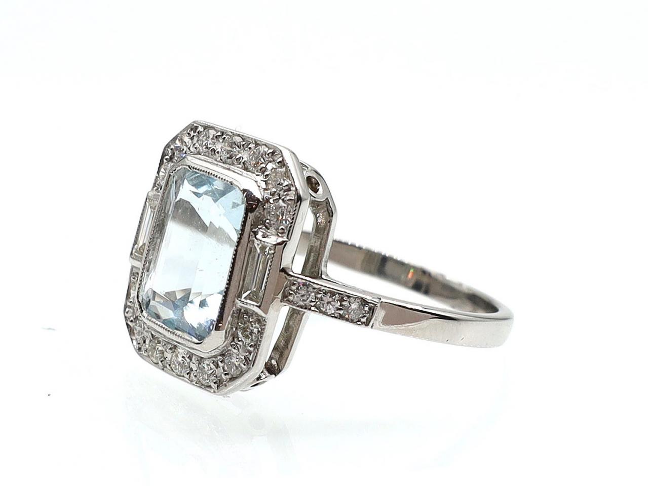 Art Deco style aquamarine and diamond cluster ring in platinum. Centred with an octangonal emerald cut aquamarine in a millegrain setting, framed to top and bottom by round cut diamonds in grain settings and flanked by two vertically set rectangular baguette cut diamonds in millegrain settings, to a geometric cluster design raised on a linear gallery supported by cheniers and met to either side with diamond set shoulders which continue to a slim shank. Marked platinum.
