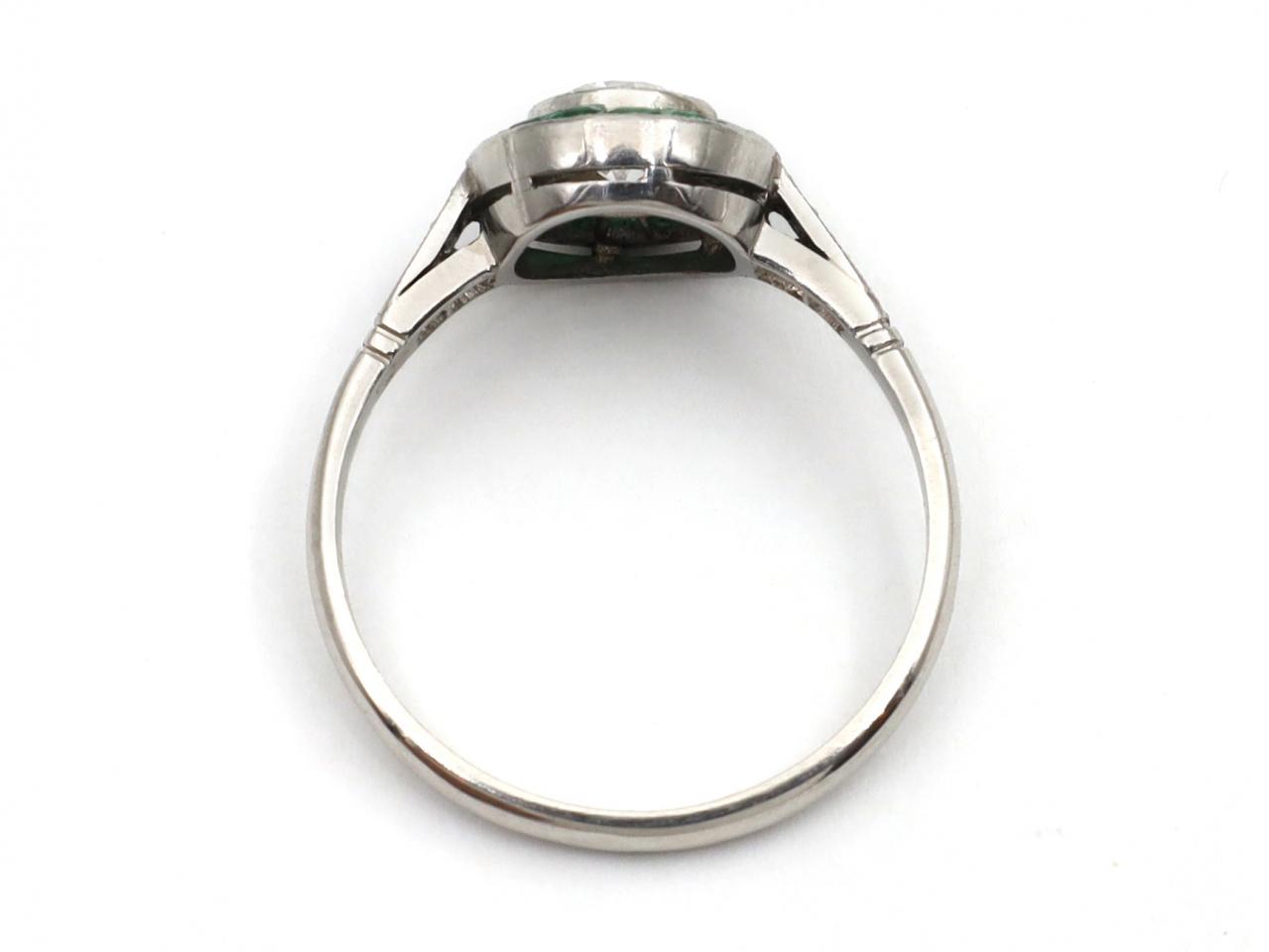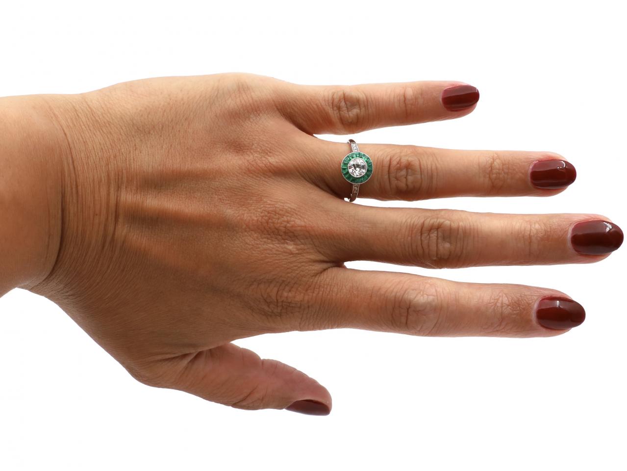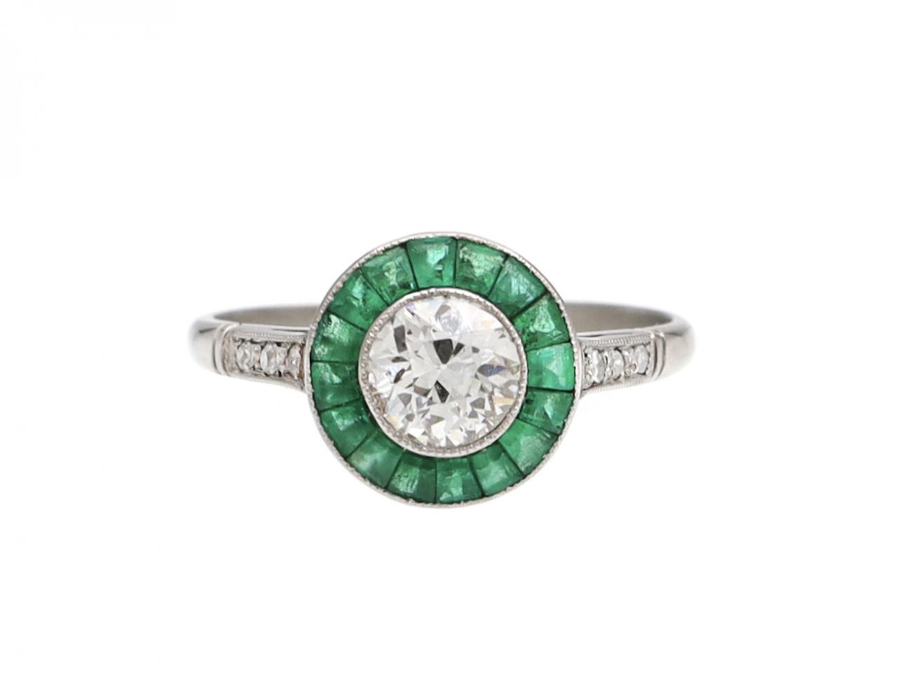 Art Deco style diamond and emerald target ring in platinum. Centrally set with an estimated 0.55ct round brilliant cut diamond in a millegrain setting, encircled by a row of calibre cut emeralds in millegrain and channel settings, to a circular target design with pierced gallery and flanked to either side with diamond set shoulders which terminate to a solid shank. Marked platinum.